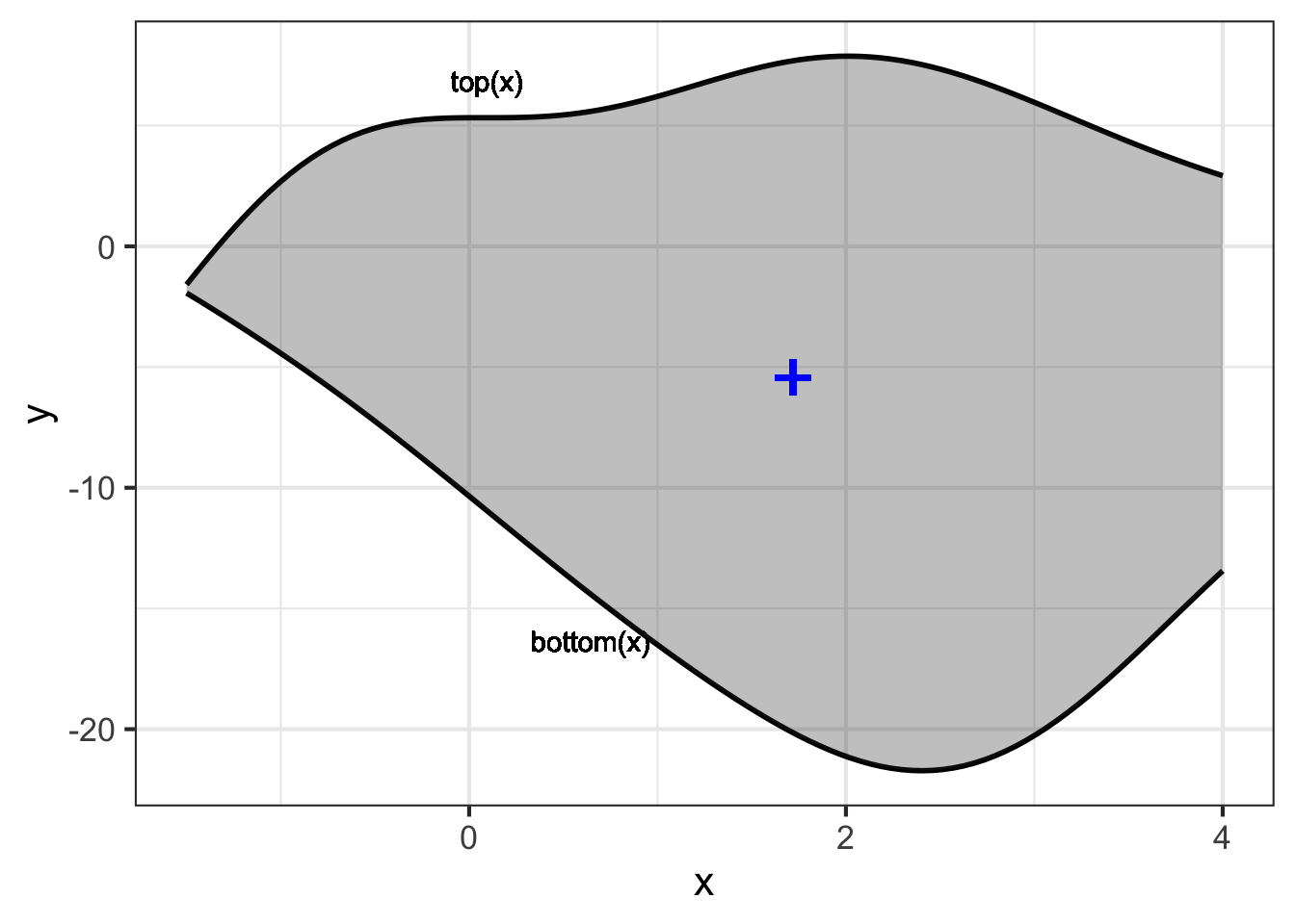 The shape is defined by two functions, \(f(x)\) and \(g(x)\), one of which sets the top edge and the other the bottom edge. The side edges are defined by the leftmost and rightmost values of \(x\). Here, that is \(x_\text{left} = - 1.5\) and \(x_\text{right} = 4.0\).