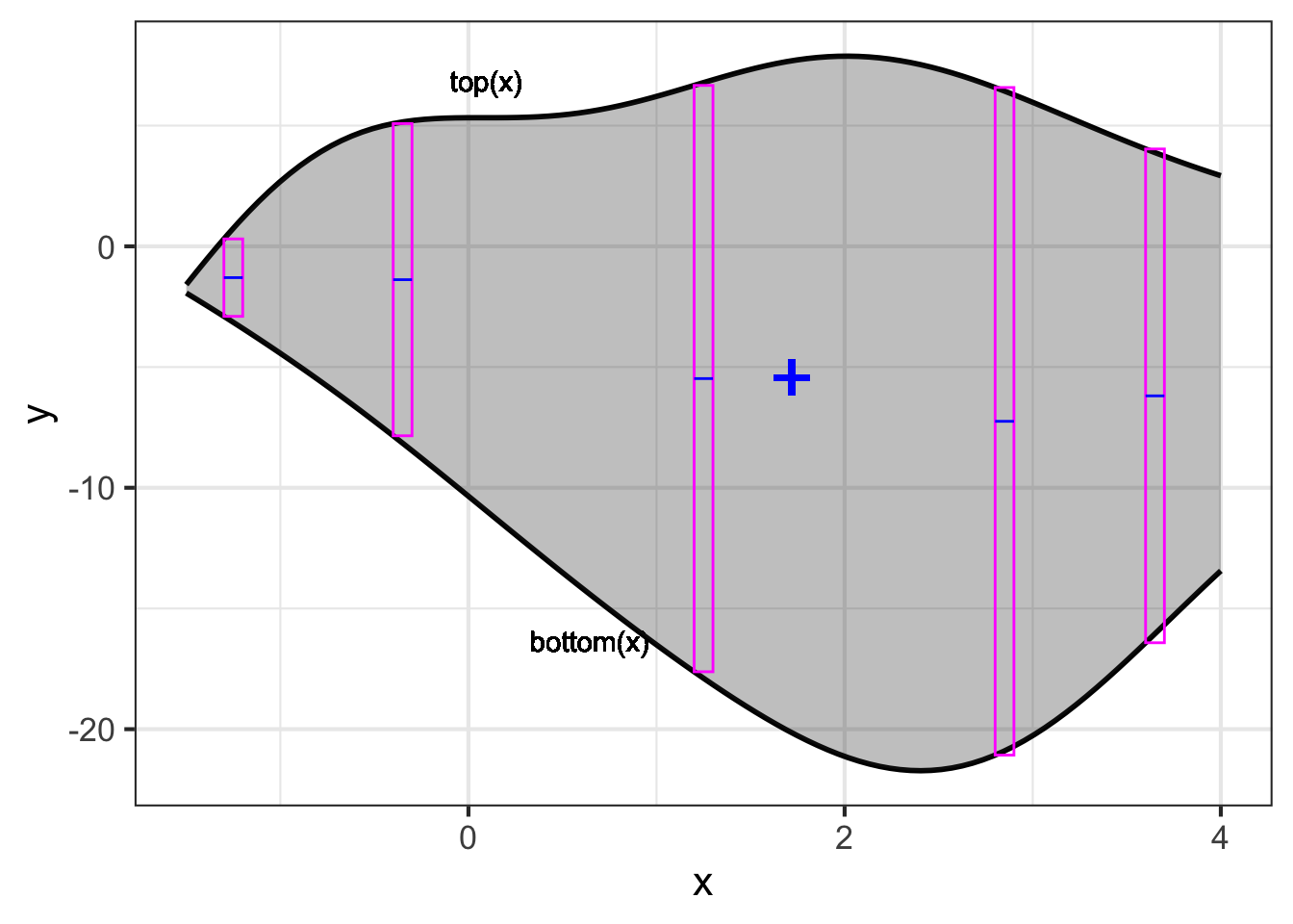 The differential \(8.1 \left[\strut f(x) - g(x)\right] dx\) gives the mass of each vertical slice of the object, several of which are shown in magenta in Figure fig-cm-fun-diff. The tops and bottoms of those slices don’t align exactly with the boundaries of the object. That is because we’ve drawn them at a finite width so that you can see them. But the actual differentials being accumulated will have negligible width, and so will fit exactly.