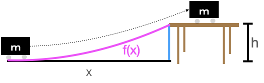 The ramp we have in mind has a surface whose height \(f(x)\) is zero at the foot (\(x=a\)) and reaches \(f(x=b) = h\) where it joins the table.