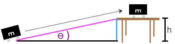 What about the mechanical work? Is that also reduced? Remember that mechanical work is the product of force times distance. The force has been reduced to \(m \sin(\theta) g\), but the distance \(D_{ramp}\) along the ramp is much longer than the distance \(h\) from floor to table top.
