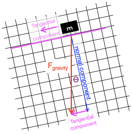 To decompose the vector of gravitational forces, we can place a coordinate grid over the gravity vector. In Figure fig-ramp-decomposition this grid has been arranged so that one cardinal direction is aligned with the ramp itself and the other is perpendicular—that is, “normal”—to the ramp. Merely by noting the coordinates of the gravitational vector in the coordinate grid, we decompose that vector into two components, one along the surface of the ramp and the other perpendicular to the ramp.