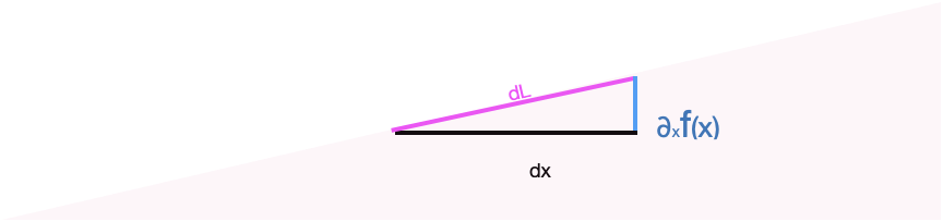The hypotenuse of the infinitesimal segment of the ramp has length \(dL = \sqrt{\strut dx + \partial_x f(x) dx}\), or \(dL = \sqrt{\strut 1 + \partial_x f(x)}\ dx\). Things are a bit simpler if we write \(dL\) using the slope angle \(\theta(x)\). Since \(dx = \cos(\theta(x)) dL\), we know \(dL = dx/\cos(\theta(x))\). Consequently the infinitesimal of work is \[dW \ = \ m g \frac{\sin(\theta(x))}{\cos(\theta(x))}\ dx\ = \ m g \tan(\theta(x)) dx \ .\]