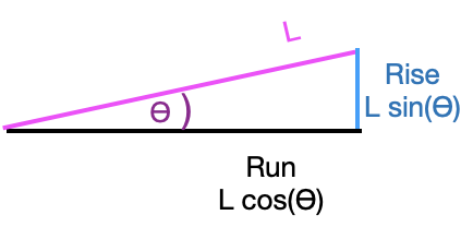 The slope of the ramp at any location \(x\) is, as you know, \(\partial_x f(x)\). It is helpful to convert this rise/run formulation of slope into the slope-angle form we used to study the simple ramp. As you can see from the diagram, which zooms in on one place on the ramp, rise over run amounts to \(L\sin(\theta) / L\cos(\theta) = \partial_x f(x) = \tan(\theta)\), with the result: \[\theta = \arctan({\large\strut}\partial_x f(x))\ .\] Consequently, the force that needs to be applied parallel to the ramp’s surface is \(m \sin(\arctan(\partial_x f(x))) g = m \sin(\theta) g\). To find the work done in pushing the mass an infinitesimal distance along the ramp we need to know the instantaneous length of the ramp. This is potentially confusing to the reader since we’ve already said that the distance is infinitesimal. As you know, infinitesimal is different from zero. We will write \(dx\) as an infinitesimal increment along the floor, but the zoomed-in length \(dL\) of the corresponding part of the ramp is the hypotenuse of a right triangle where one leg has length \(dx\) and the other leg has length \(\partial_x f(x) dx\): slope times distance.