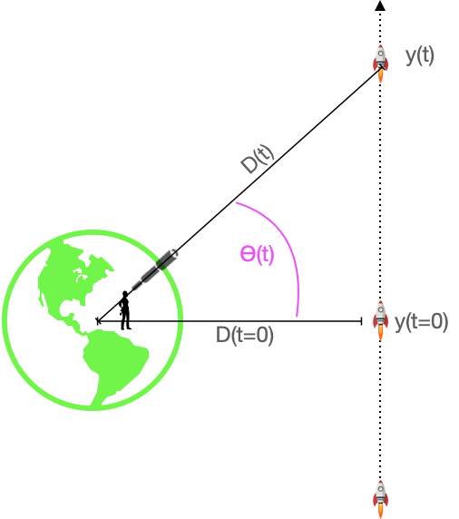 Three points in the diagram describe a right triangle: the probe’s position at \(t=0\), the center of the planet, and the probe’s position at time \(t\). The length of the horizontal leg of the triangle is \(D(t=0)\) which not a function of time, so we will drop the unnecessary parentheses and write it as \(D_0\). The vertical leg has length \(y(t)\), and the hypotenuse has length \(D(t)\). The Pythagorean theorem tells us that \[D(t)^2 = y(t)^2 + D_0^2\ .\]