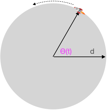The angular coordinate representation is helpful when studying the rotation of objects. To illustrate, imagine a different configuration for the system than that in in Figure fig-probe-constant where the space probe was free to accelerate in a straight line. Instead, suppose the rocket is mounted on a carousel, that is a wheel whose axle goes through the center as in Figure fig-rocket-on-disk.