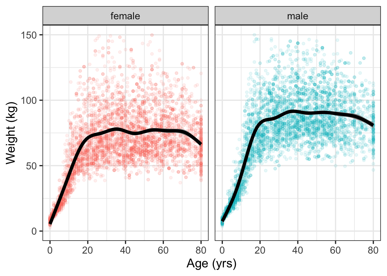 NHANES data frame showing weight against age for 10,000 individuals. A model function (black) fitted to the data is also shown.