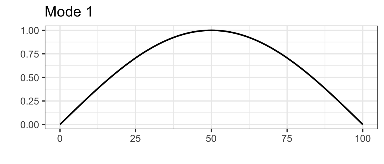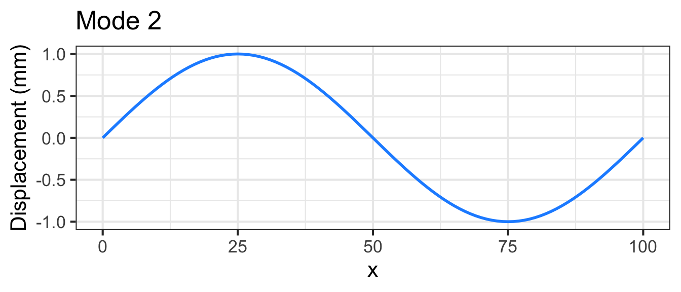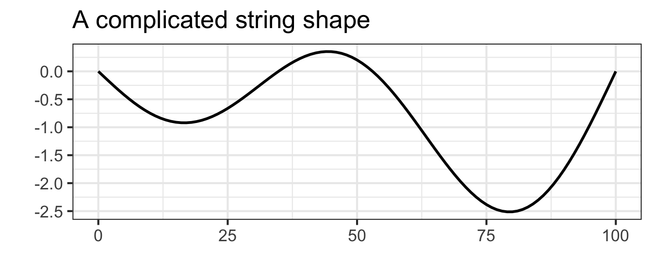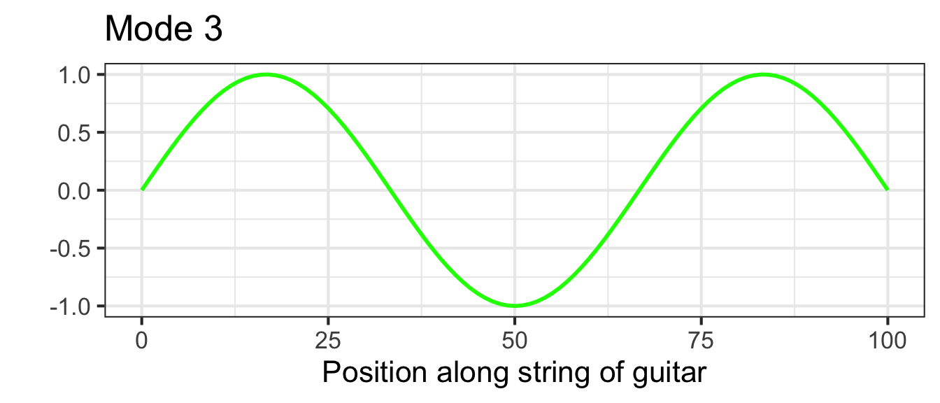 For a string of length \(L\), the string displacement is a function of position \(x\) along the string and is a linear combination of functions of the form \[g_k(x) \equiv \sin(k \pi x /L)\] where \(k\) is an integer. A few of these functions are graphed in Figure fig-guitar-string-modes with \(k=1\), \(k=2\), and \(k=3\).