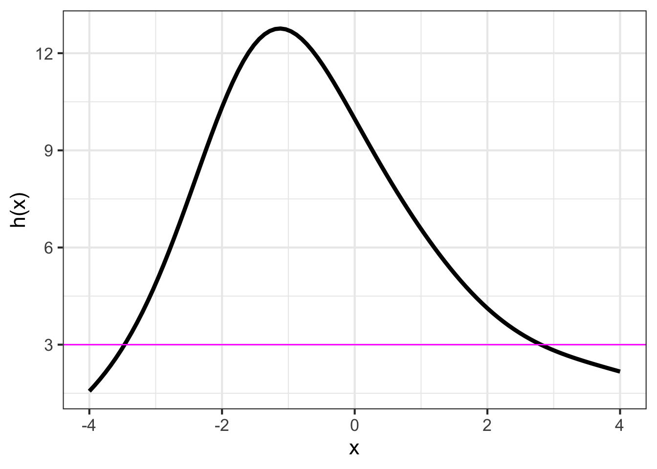 - Draw a horizontal line located at the value on the right-hand side of the equation \(h(x_0) = 3\). (This is the magenta line in Figure fig-zero-finding1.)