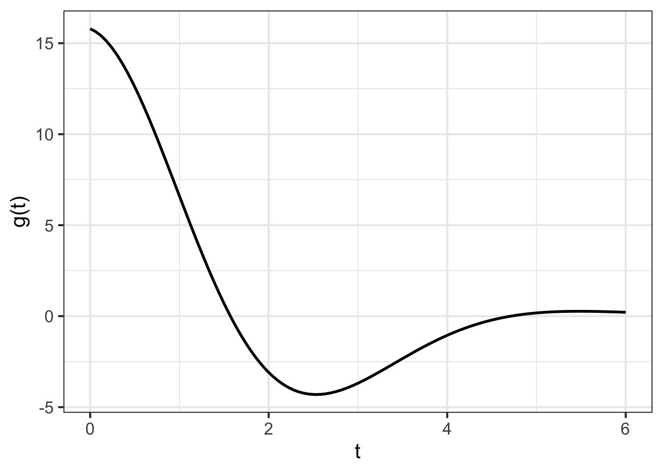 The output produced by Zeros() is a data frame with one row for each of the \(x_0\) found. Here, two values were found: \(x_0 = -2.92\) and \(x_0 = 0.0795\), shown as vertical lines in Figure fig-doodle-579. The .output column reports \(f(x_0)\). In principal, this should be exactly zero. However, computer arithmetic is not always exactly precise. Even so, numbers as small as those in the .output. column—\(-3.4 \times 10^{-8}\) for example—are miniscule compared to the range of values seen in Figure fig-doodle-579.
