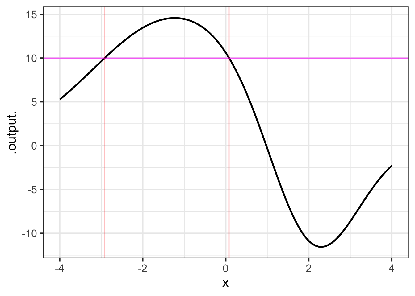 Zeros() is set up to find inputs where the mathematical function defined in the tilde expression produces zero as an output. But suppose you are dealing with a problem like \(f(x) = 10\)? You can modify the tilde expression so that it implements a slightly different function: \(f(x) - 10\). If we can find \(x_0\) such that \(f(x_0) - 10 = 0\), that will also be the \(x_0\) satisfying \(f(x_0) = 10\).