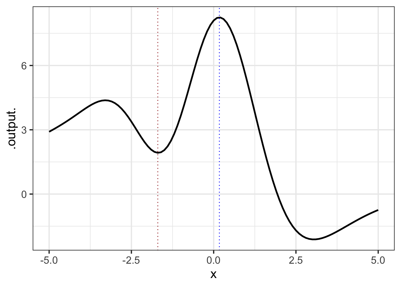 The x column holds the argmax and argmin, the .output. column gives the value of the function output for the input x. The concavity column tells whether the function’s concavity at x is positive or negative. Near a peak, the concavity will be negative; near a valley, the concavity is positive. Consequently, you can see that the first row of the data frame corresponds to a local minimum and the second row is a local maximum.