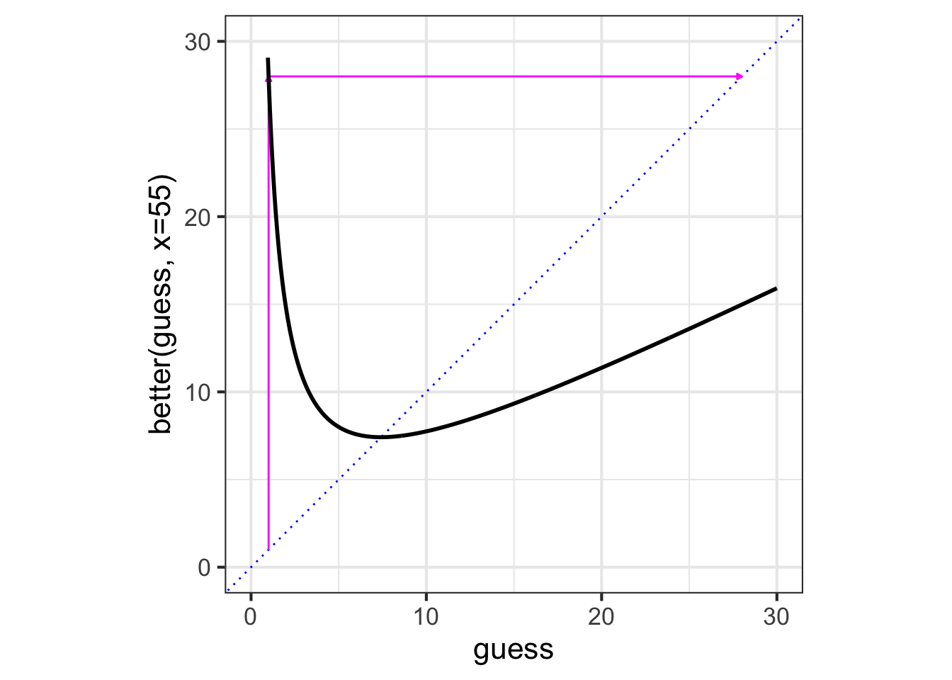 The people—more than two thousand years ago—who invented the ideas behind the better() function were convinced that better() constructs a better guess for the answer we seek. It is not obvious why 28 should be a better guess than 1 for \(\sqrt{\strut x=55}\) but, out of respect, let’s accept their claim.