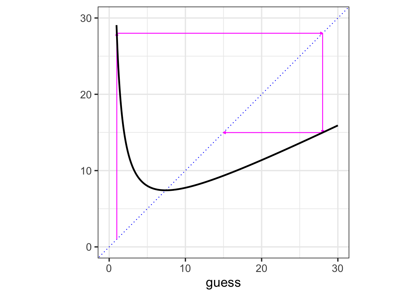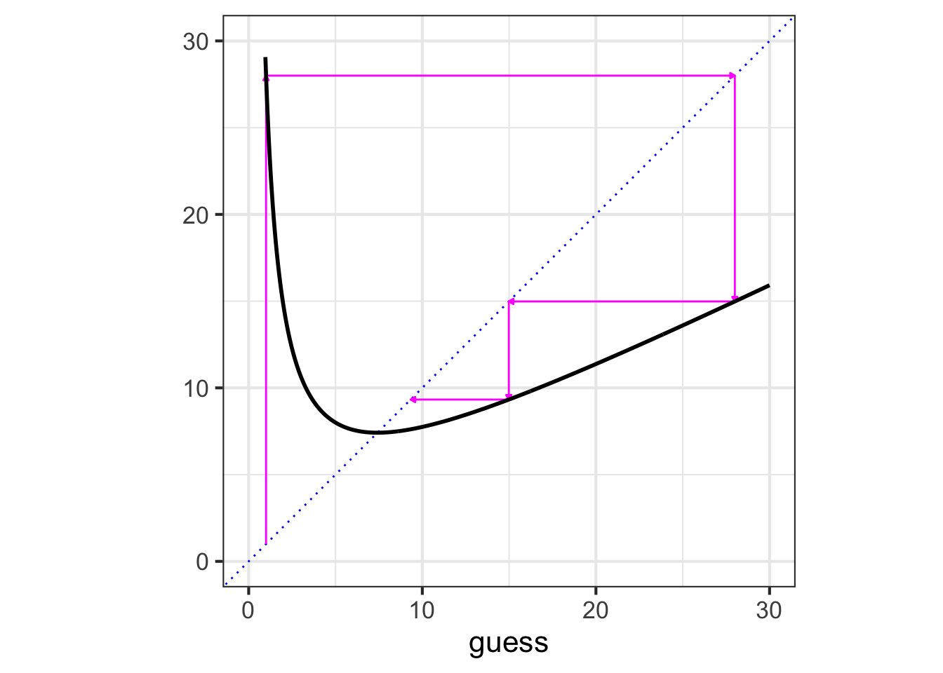The output produced by Iterate() is a data frame. The initial guess is in the row with \(n=0\). Successive rows give the output, step by step, with each new iteration step.