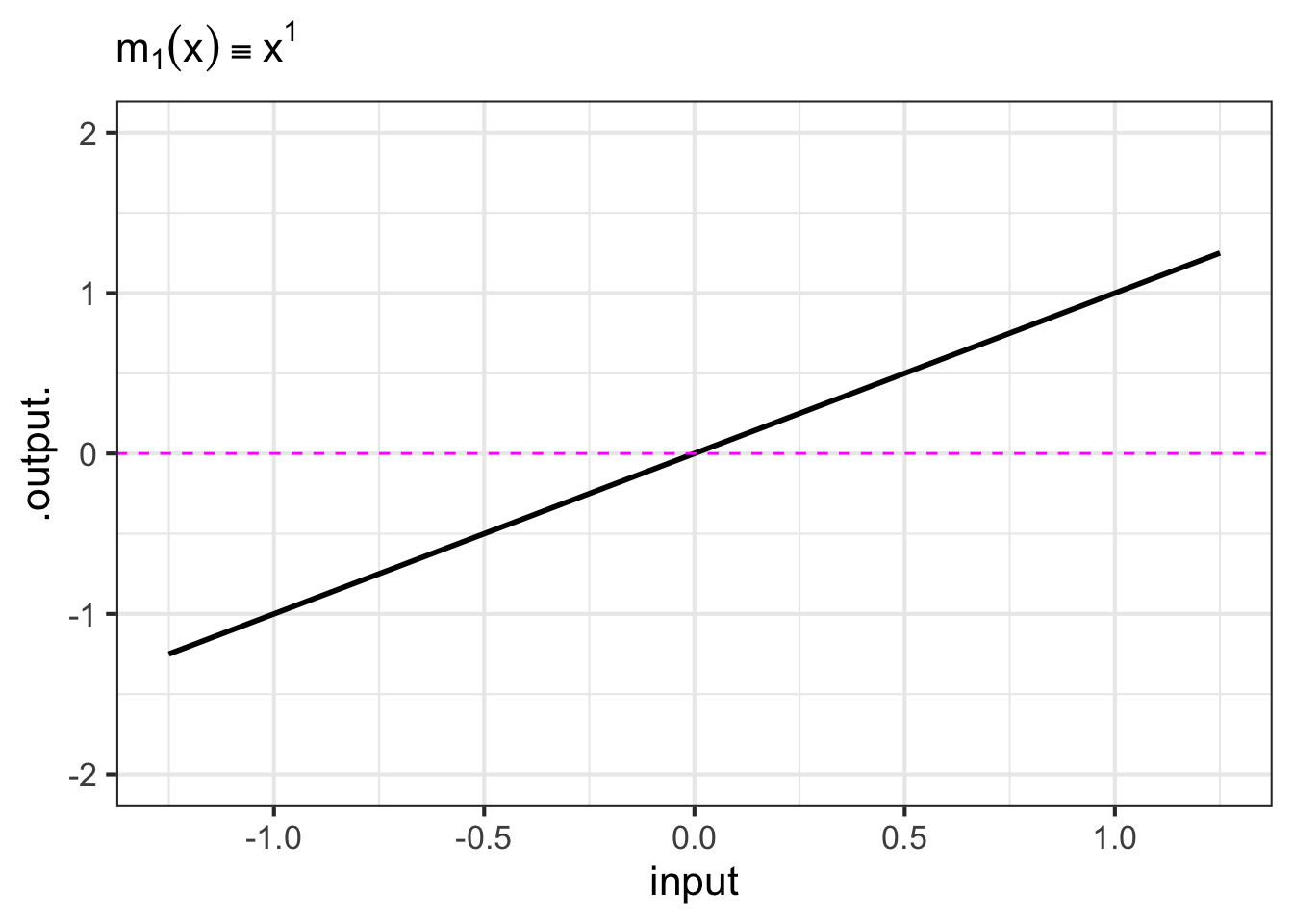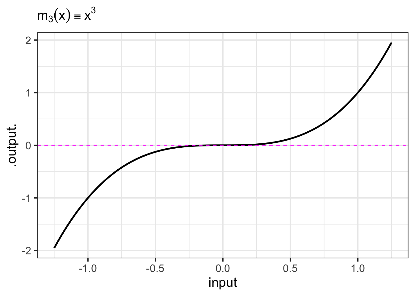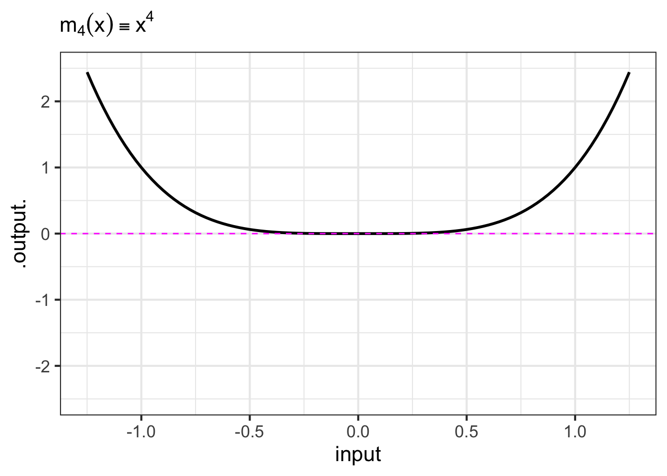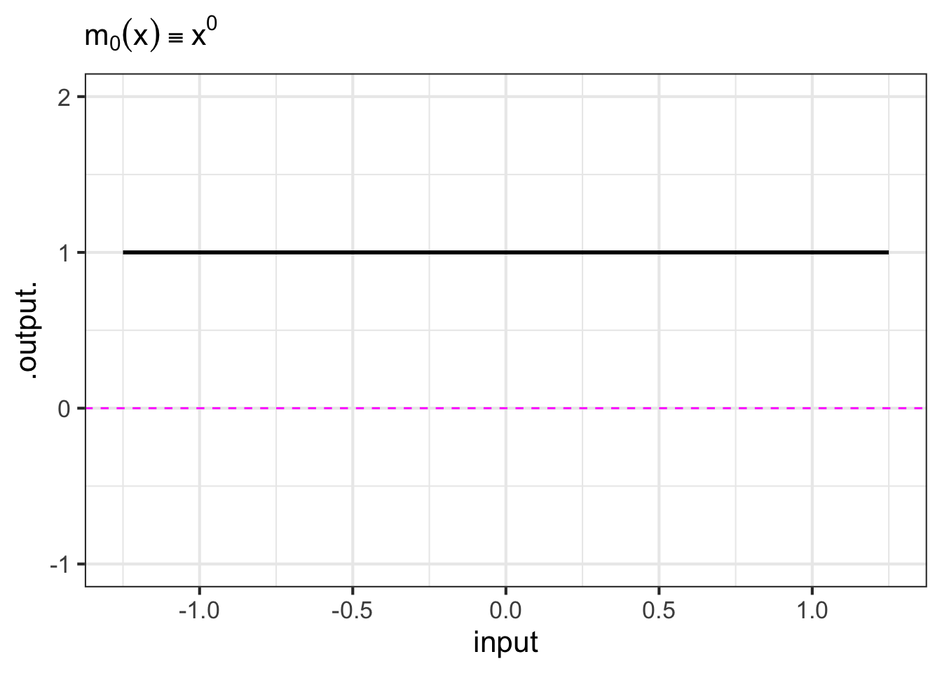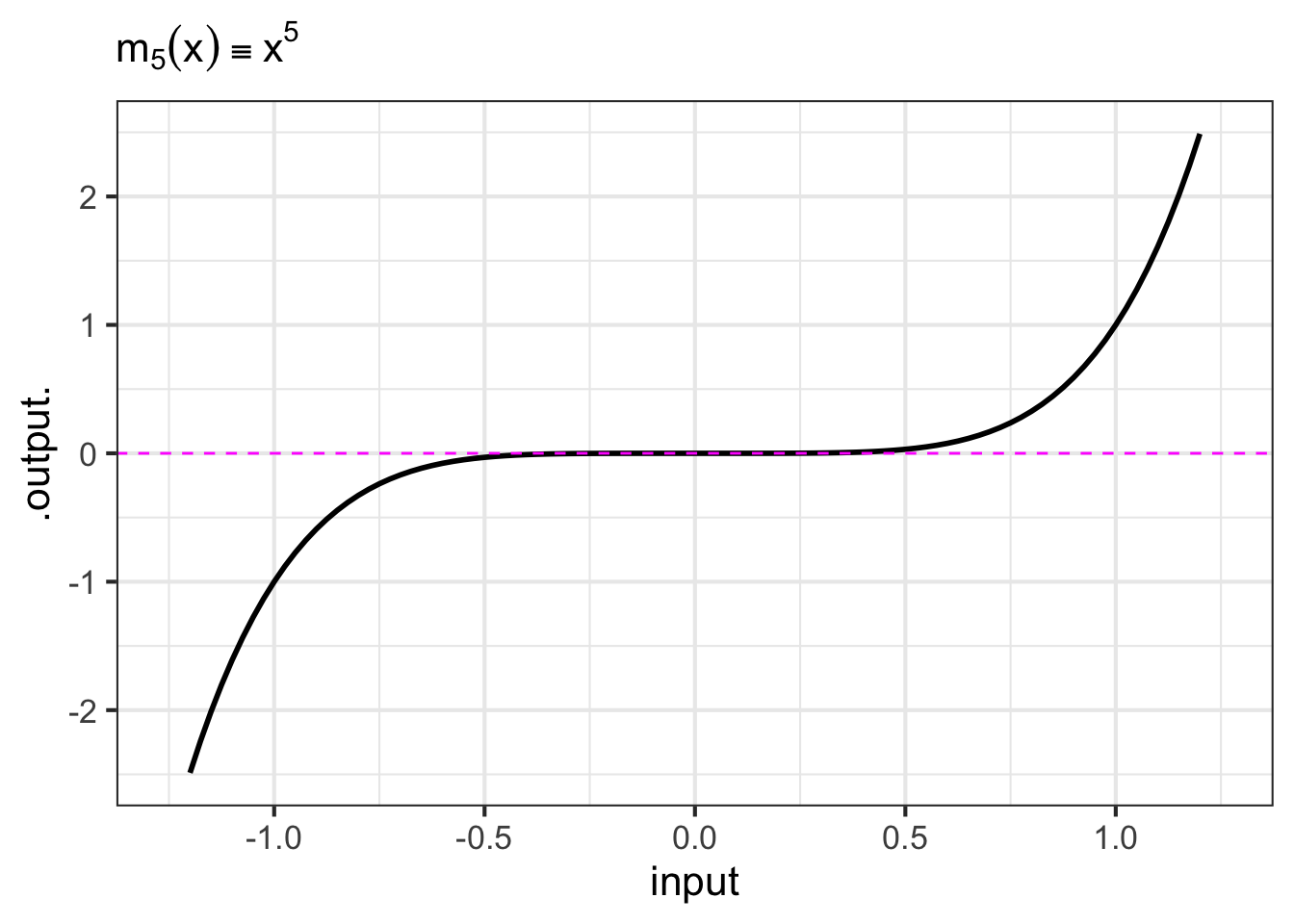 - The monomials. These are power-law functions such as \(m_0(x) \equiv x^0\), \(m_1(x) \equiv x^1\), \(m_2(x) \equiv x^2\), \(\ldots\), \(m_p(x) \equiv x^p\), \(\ldots\), where \(p\) is a whole number (i.e., a non-negative integer). Of course, \(m_0()\) is the same as the constant function, since \(x^0 = 1\). Likewise, \(m_1(x)\) is the same as the identity function since \(x^1 = x\). As for the rest, they have just two general shapes: both arms up for even powers of \(p\) (like in \(x^2\), a parabola); one arm up and the other down for odd powers of \(p\) (like in \(x^3\), a cubic). Indeed, you can see in Figure fig-monomial-graphs that \(x^4\) has a similar shape to \(x^2\) and that \(x^5\) is similar in shape to \(x^3\). For this reason, high-order monomials are rarely needed in practice.