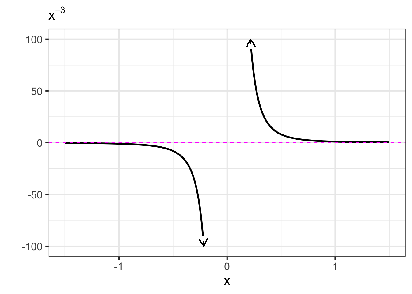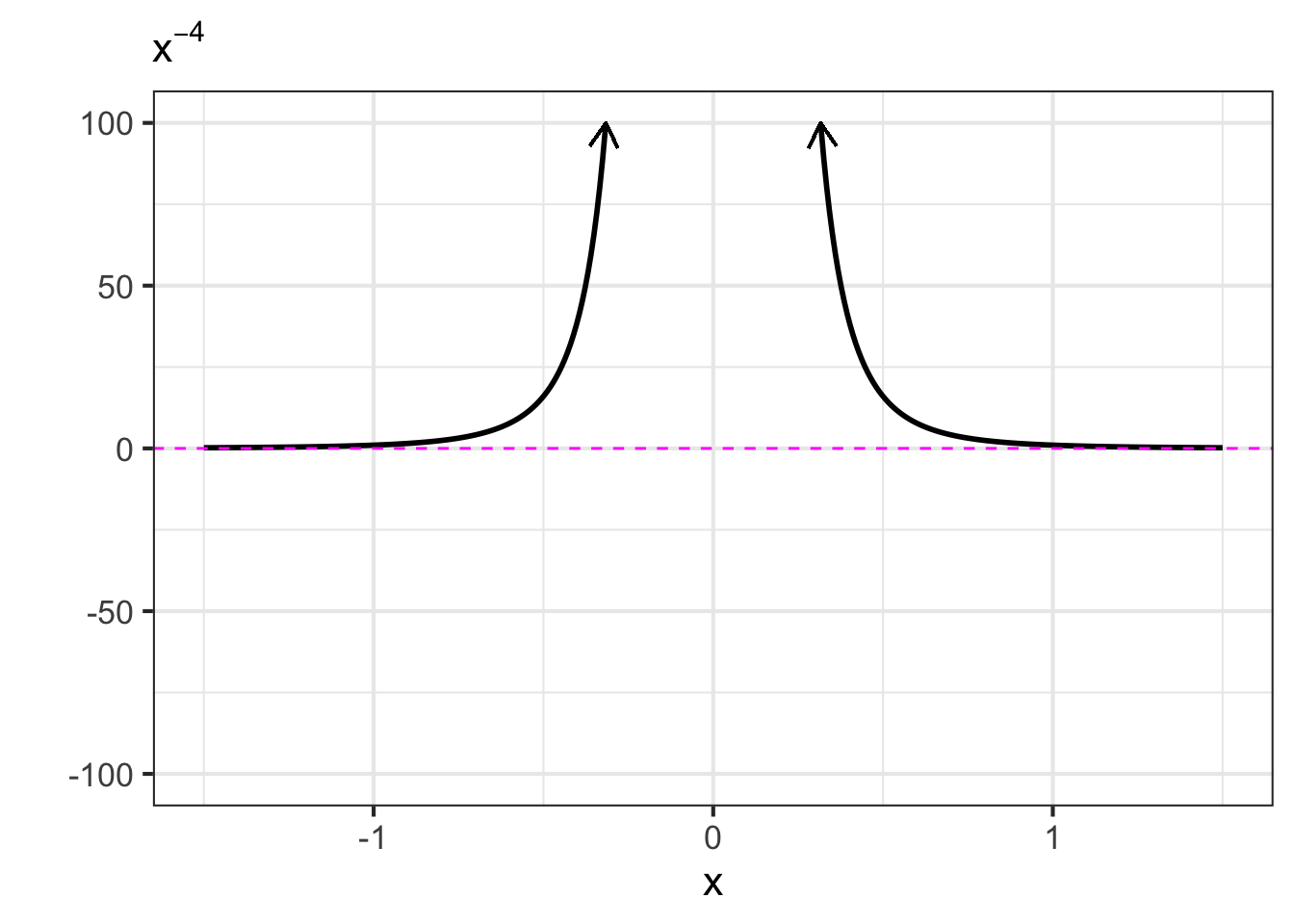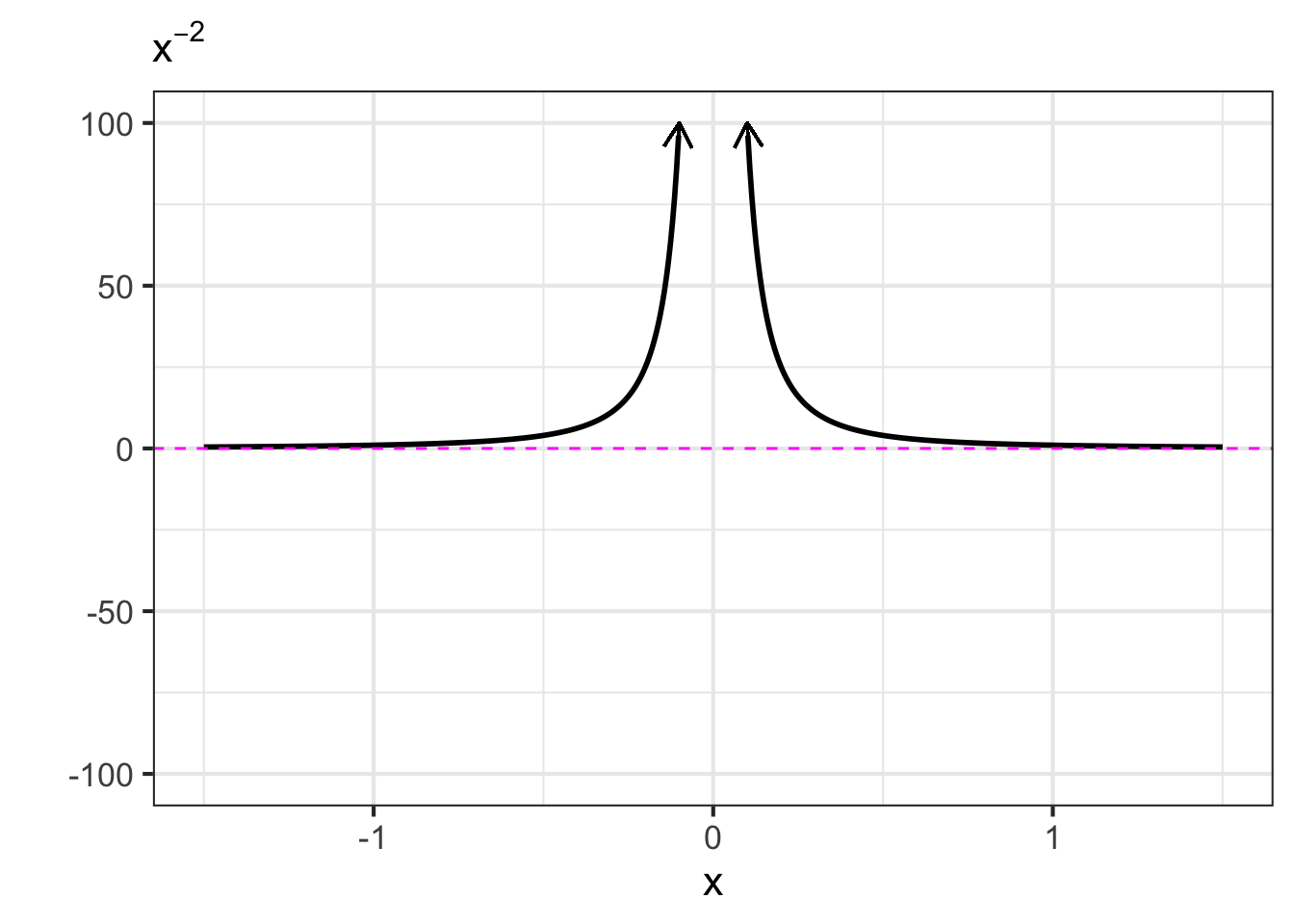 - When \(p\) is negative, the output of the function is undefined when \(x=0\). You can see why with a simple example: \(g(x) \equiv x^{-2}\). Most students had it drilled into them that “division by zero is illegal,” and \(g(0) = \frac{1}{0} \frac{1}{0}\), a double law breaker.
