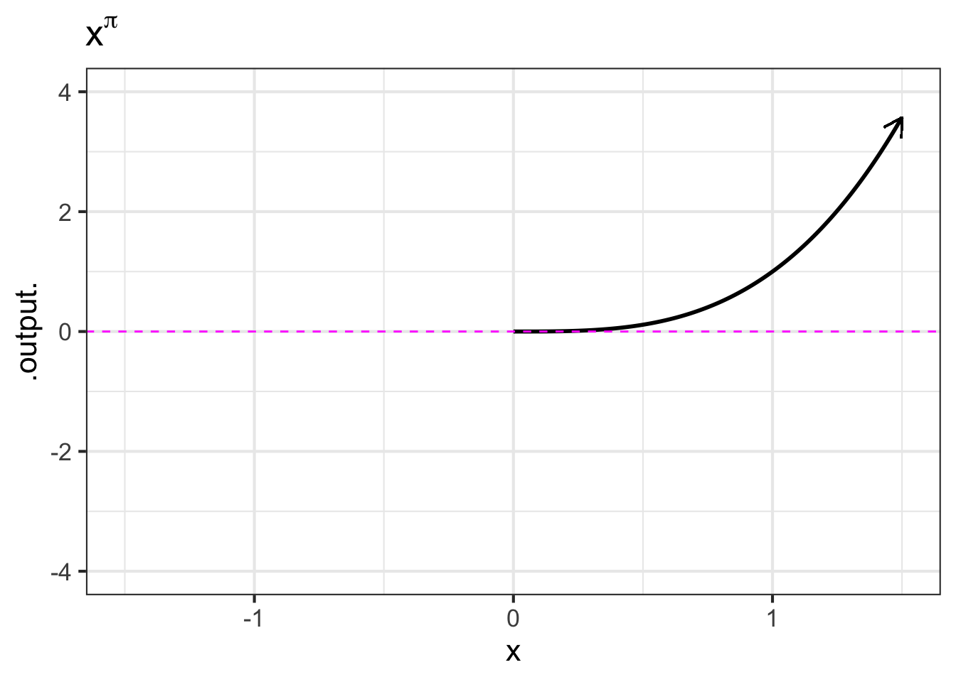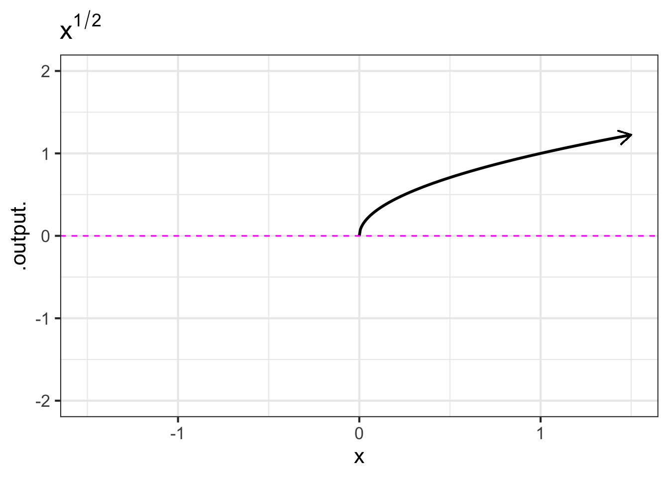- The non-integer powers, e.g. \(f(x) = \sqrt{x}\), \(g(x) = x^\pi\), and so on. When \(p\) is either a fraction or an irrational number (like \(\pi\)), the real-valued power-law function \(x^p\) can only take non-negative numbers as input. In other words, the domain of \(x^p\) is \(0\) to \(\infty\) when \(p\) is not an integer. You have likely already encountered this domain restriction when using the power law with \(p=\frac{1}{2}\) since \(f(x)\equiv x^{1/2}=\sqrt{x}\), and the square root of a negative number is not a real number. You may have heard about the imaginary numbers that allow you to take the square root of a negative number, but for the moment, you only need to understand that when working with real-valued power-law functions with non-integer exponents, the input must be non-negative. (The story is a bit more complicated since, algebraically, rational exponents like \(1/3\) or \(1/5\) with an odd-valued denominator can be applied to negative numbers. Computer arithmetic, however, does not recognize these exceptions.)