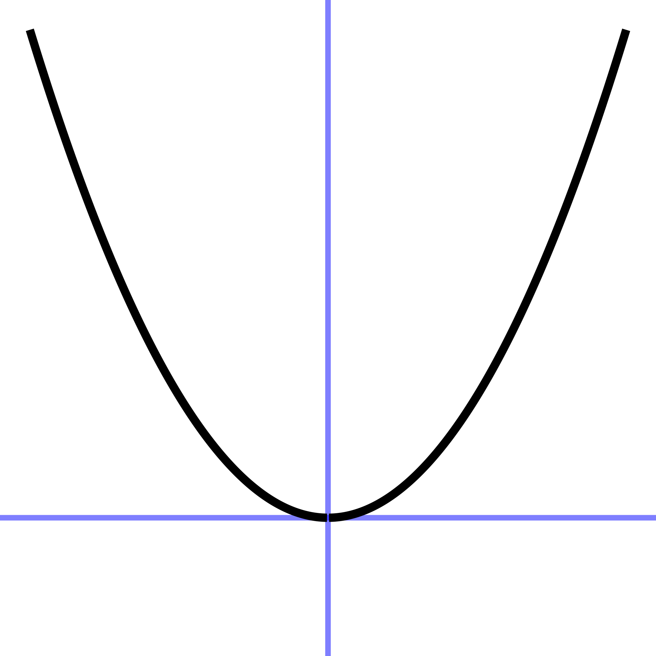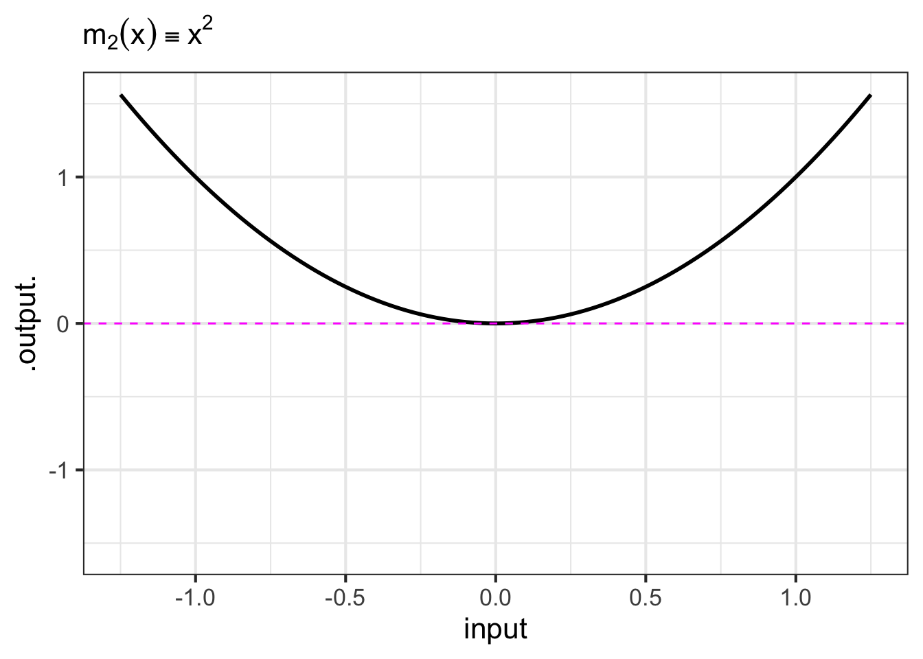 The square function has output zero when the input is zero. As the input gets farther from zero, the output grows producing the familiar shape of a parabola. It is a member of a large family of functions called the “power-law” functions. This family is described more extensively in sec-power-law-family.