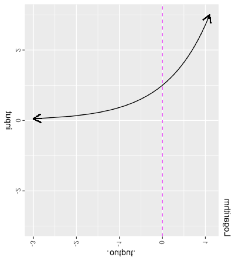 The exponential and logarithmic functions are intimate companions. You can see the relationship by taking the graph of the logarithm, and rotating it 90 degrees, then flipping left for right as in Figure fig-log-flipped. (Note in Figure fig-log-flipped that the graph is shown as if it were printed on a transparency which we are looking at from the back.)