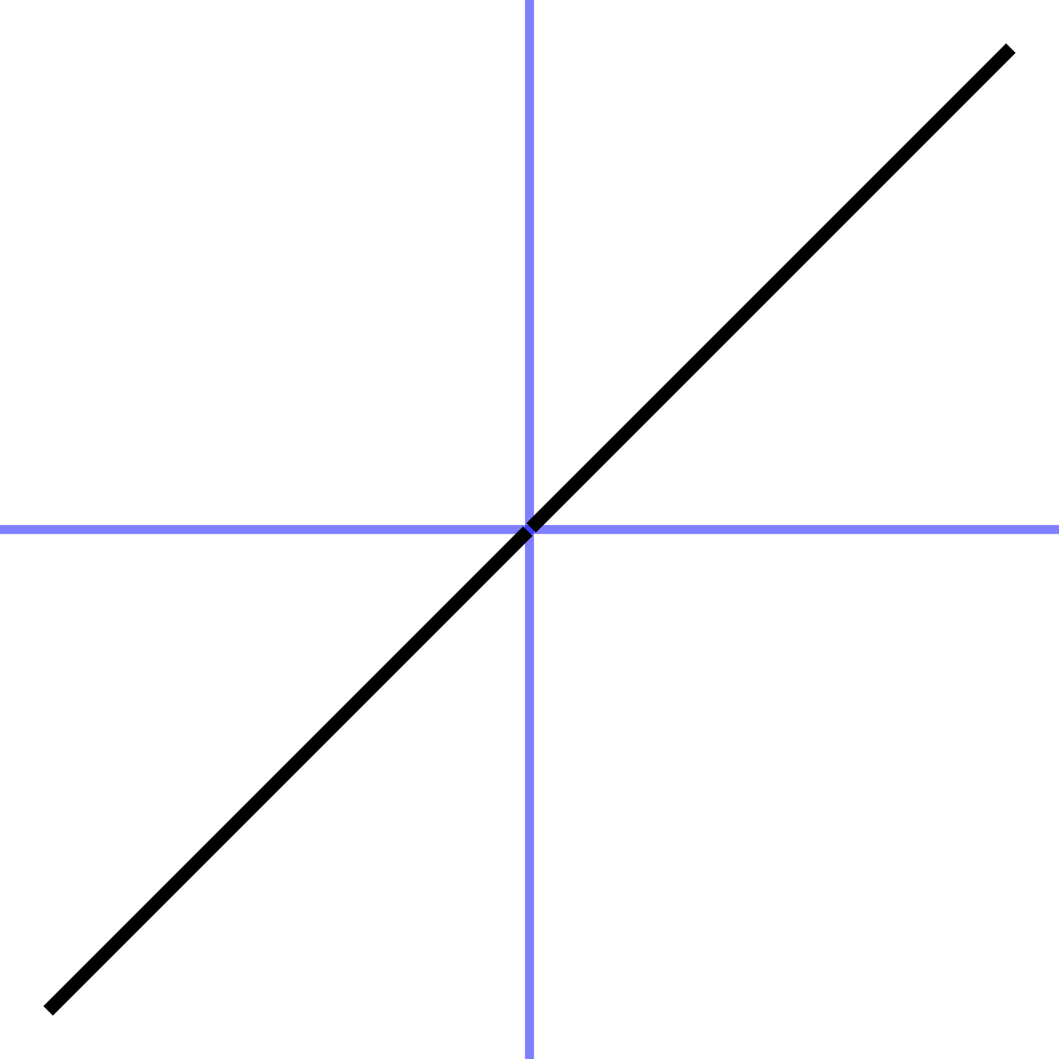 The identity function is also simple. Whatever is the input will become the output, that is, the output is identical to the input. The graph of the identity function is a straight line going through \((0,0)\) with slope 1.