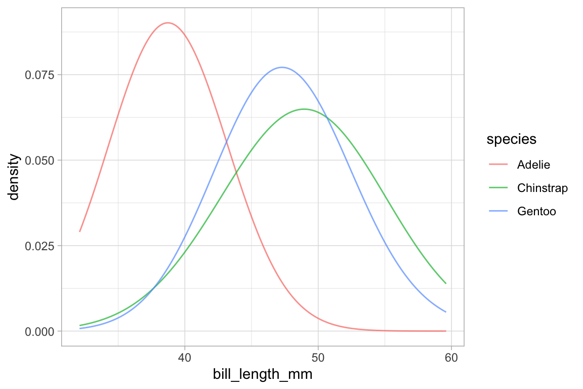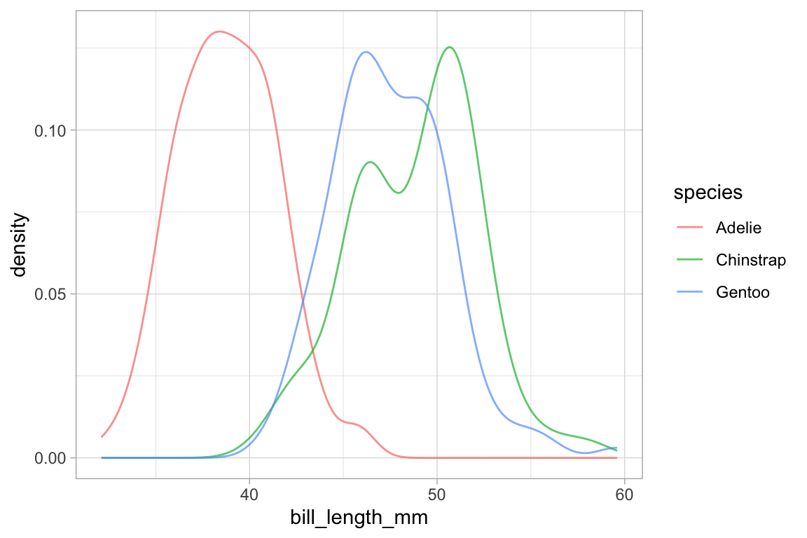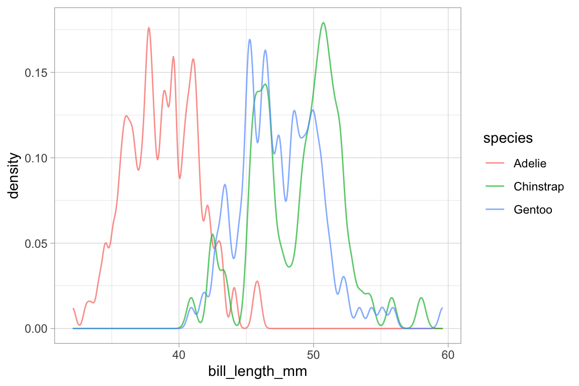 gf_dens(~bill_length_mm, color = ~species, alpha = 0.7, data = penguins)