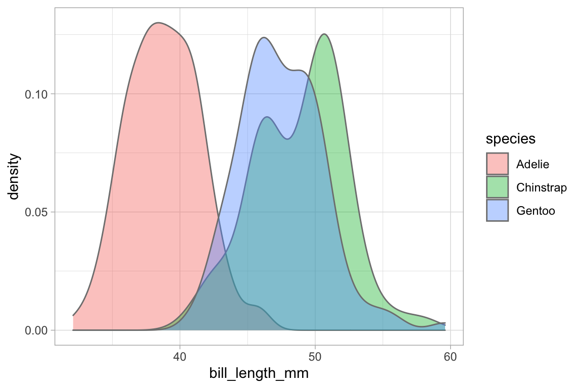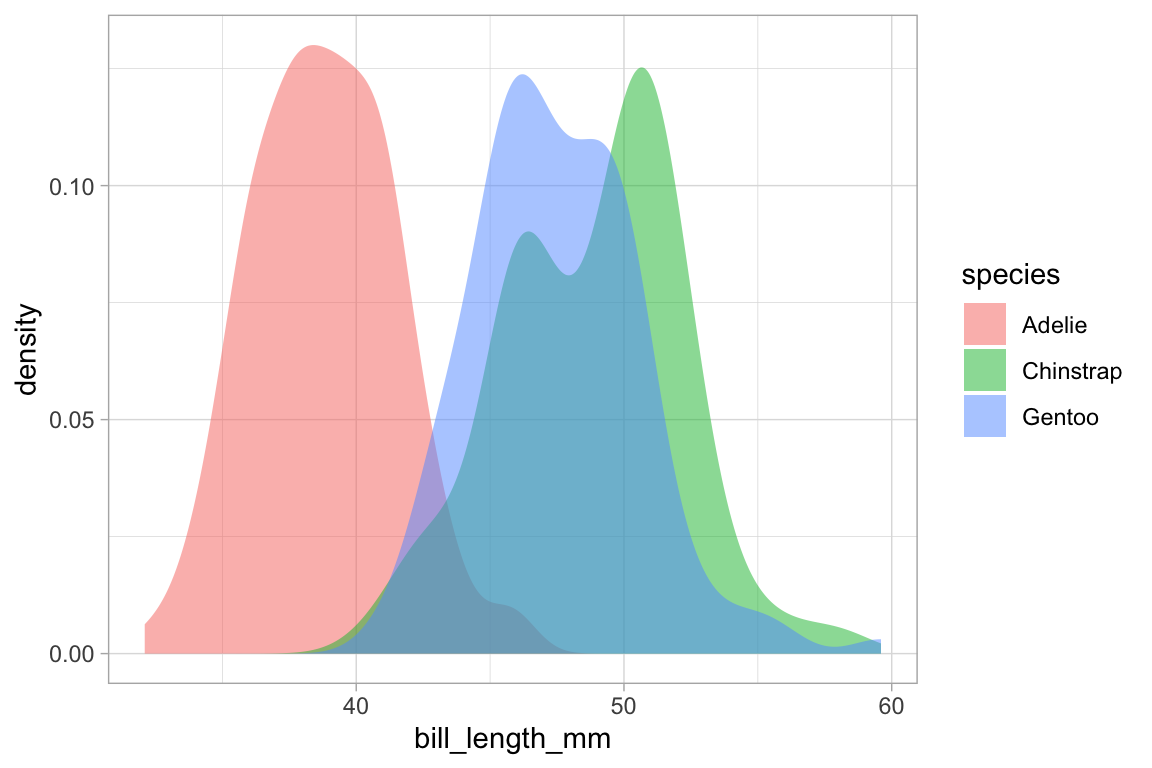 gf_density(~bill_length_mm, fill = ~species, alpha = 0.5, data = penguins)