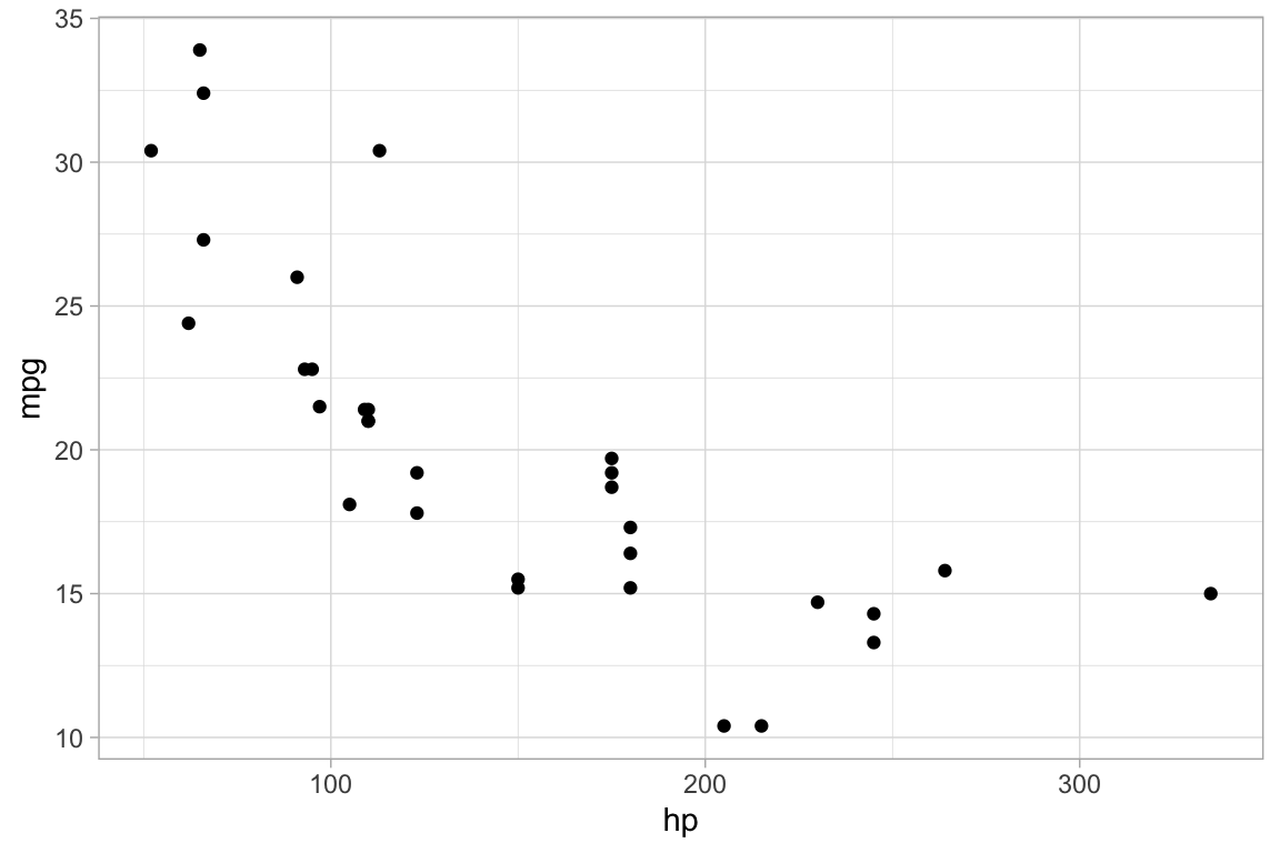 We’ve told R to put mpg along the y-axis and hp along the x-asis, as is clear from the plot.