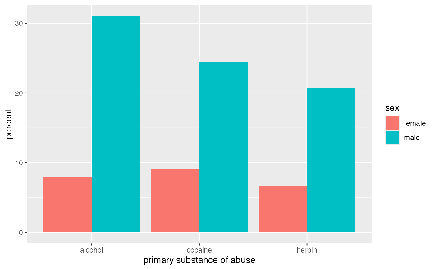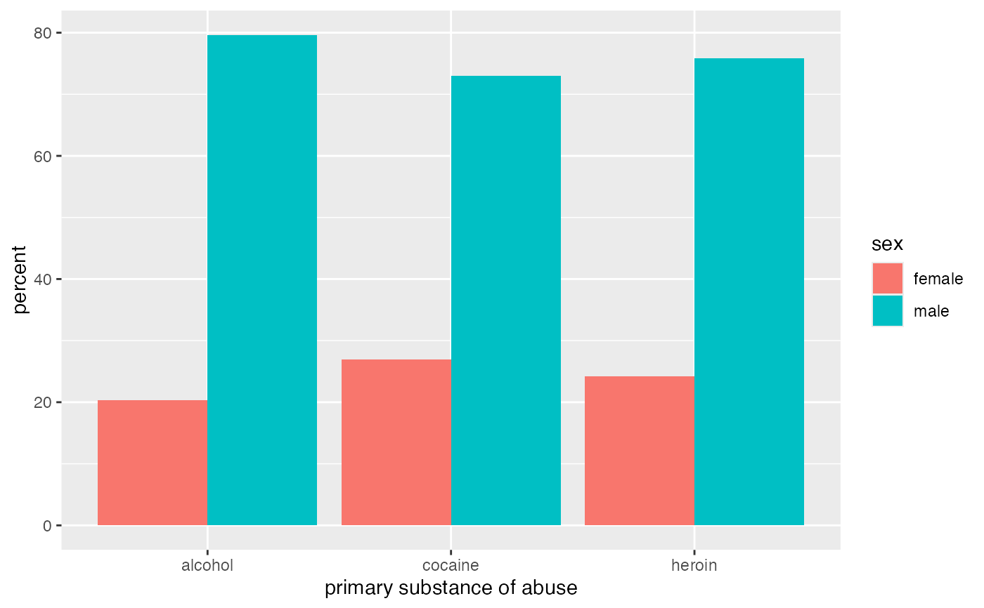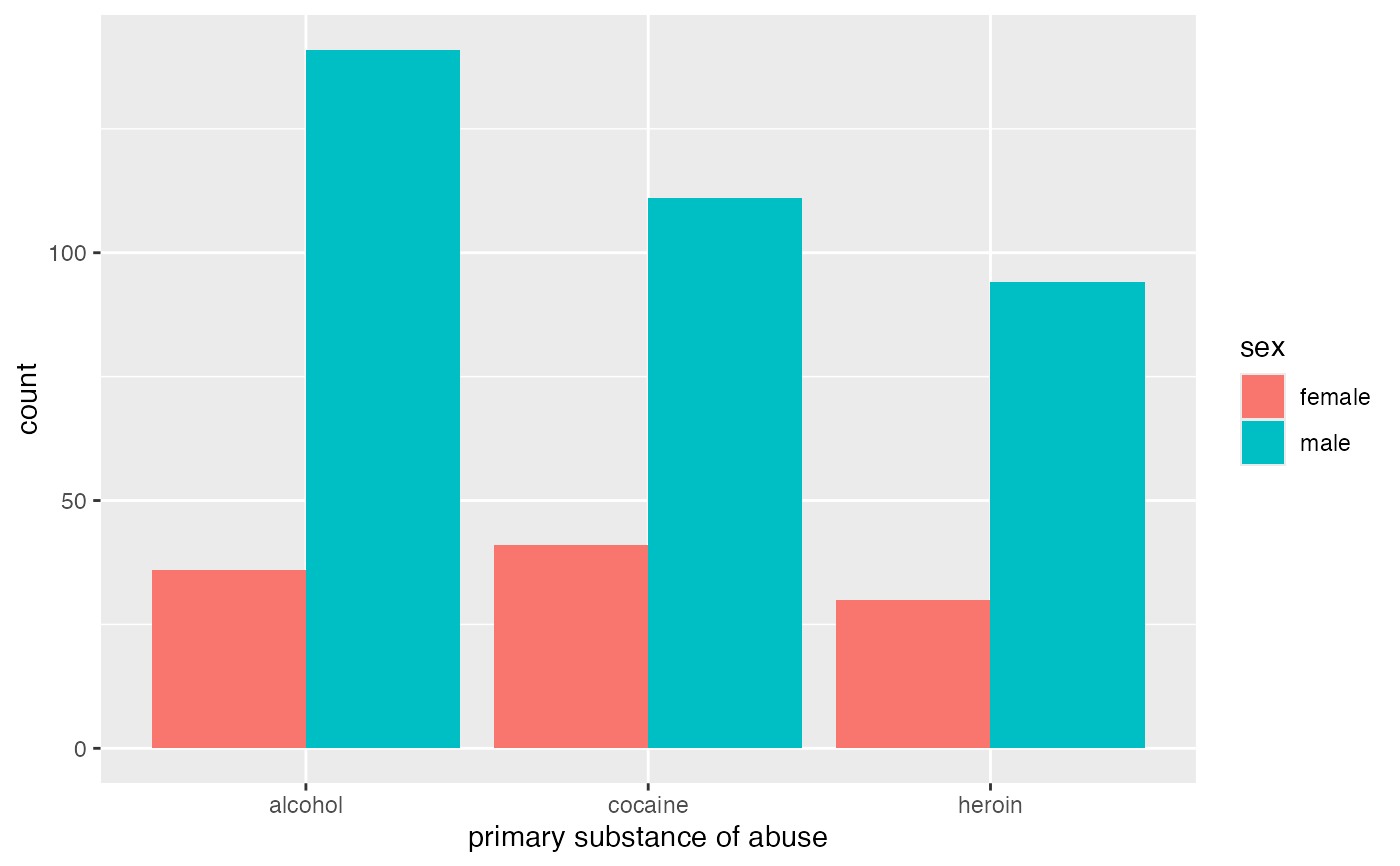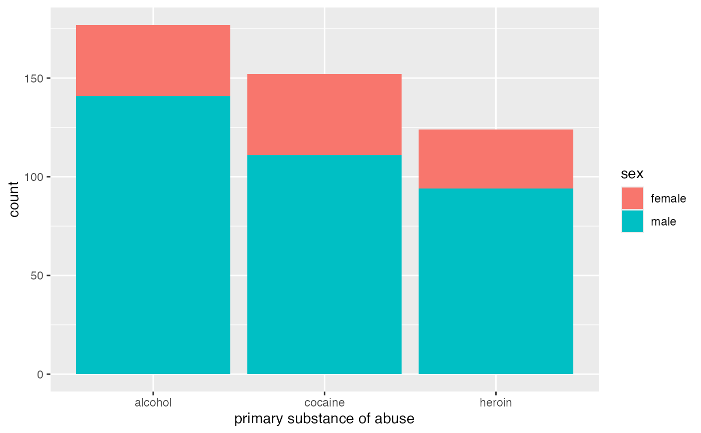 gf_bar(~substance, data = mosaicData::HELPrct, fill = ~sex)