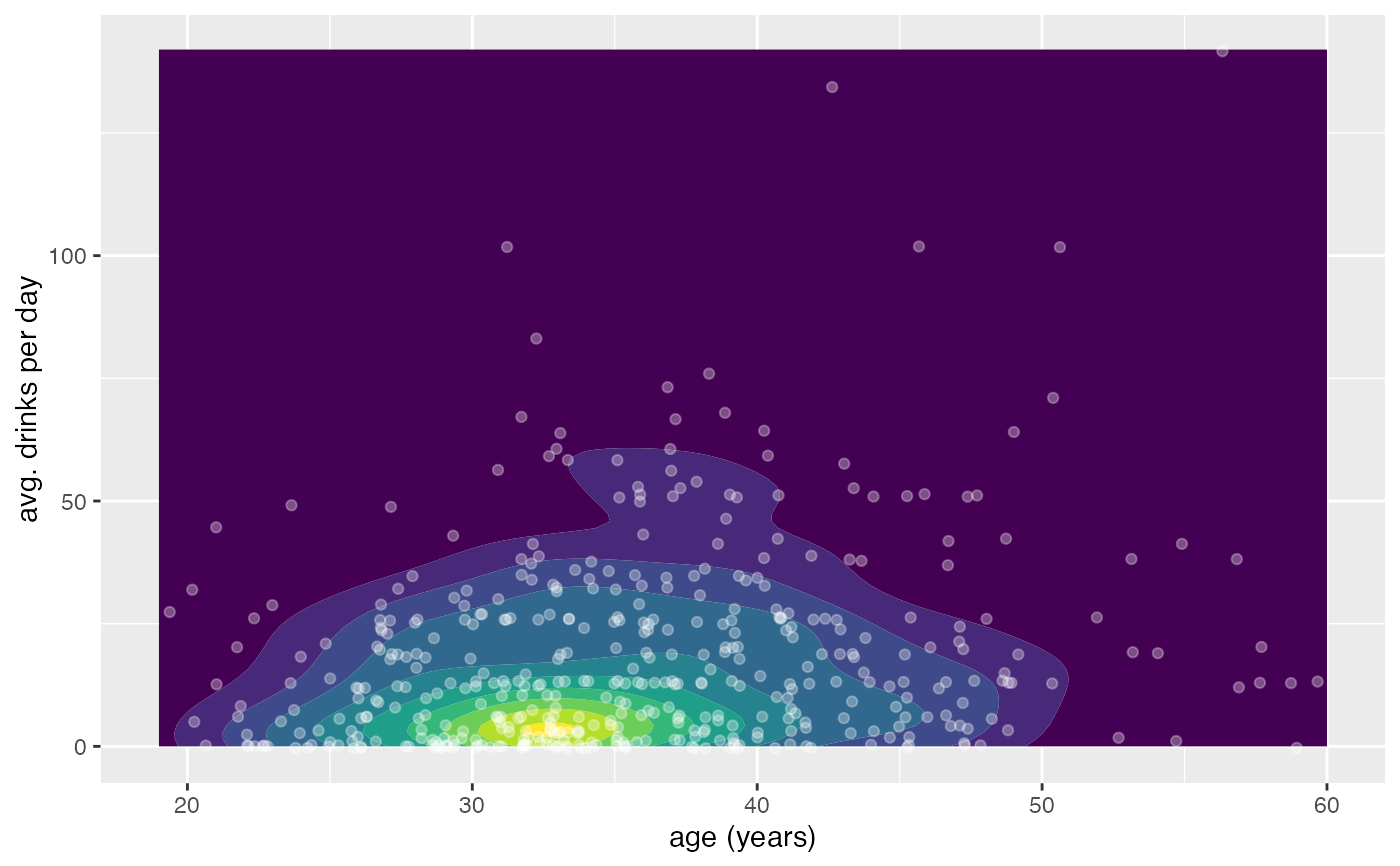 gf_density_2d_filled(avg_drinks ~ age, data = mosaicData::HELPrct, show.legend = FALSE) |>