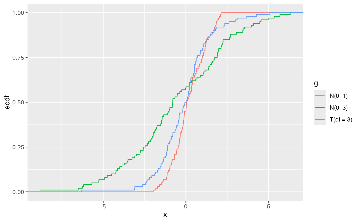 g = gl(3, 100, labels = c("N(0, 1)", "N(0, 3)", "T(df = 3)") )