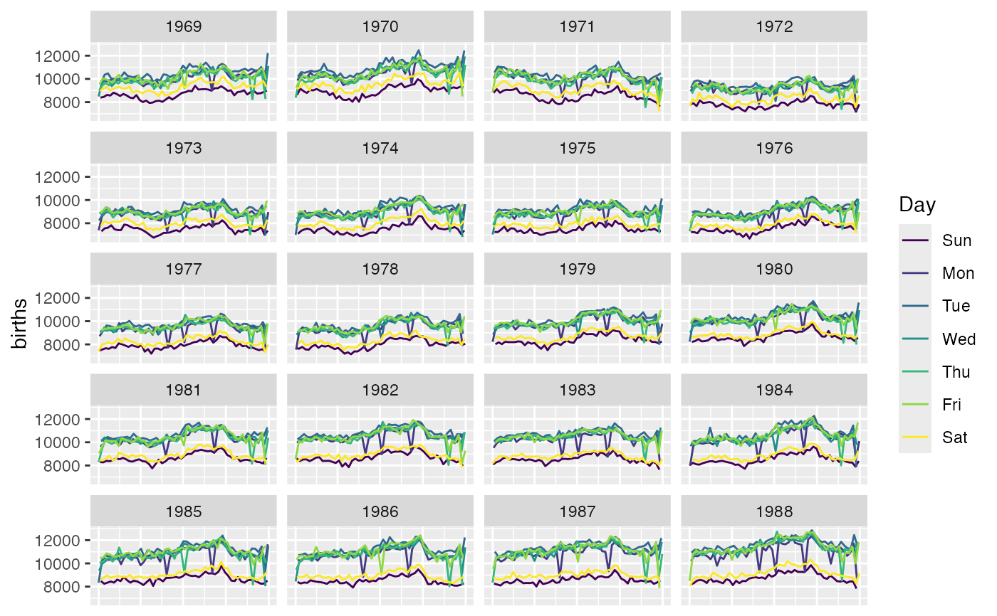 gf_line(births ~ date, data = mosaicData::Births, color = ~wday) |>