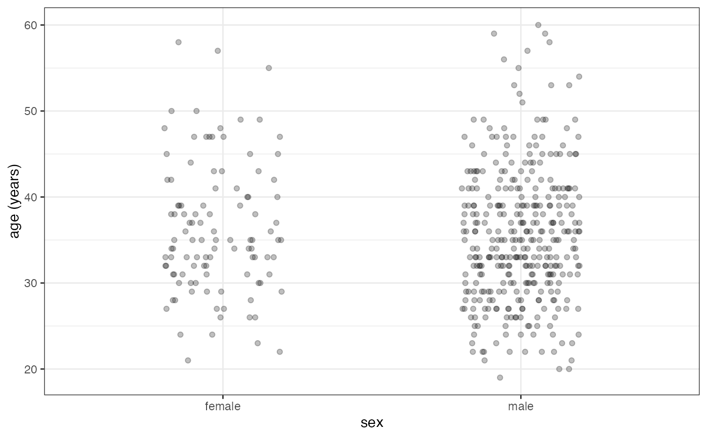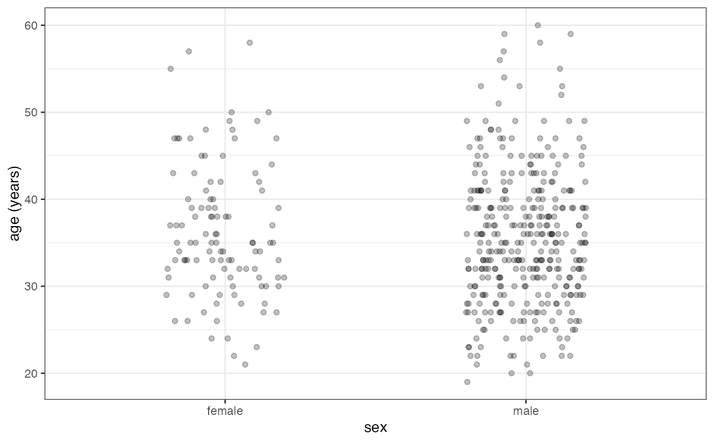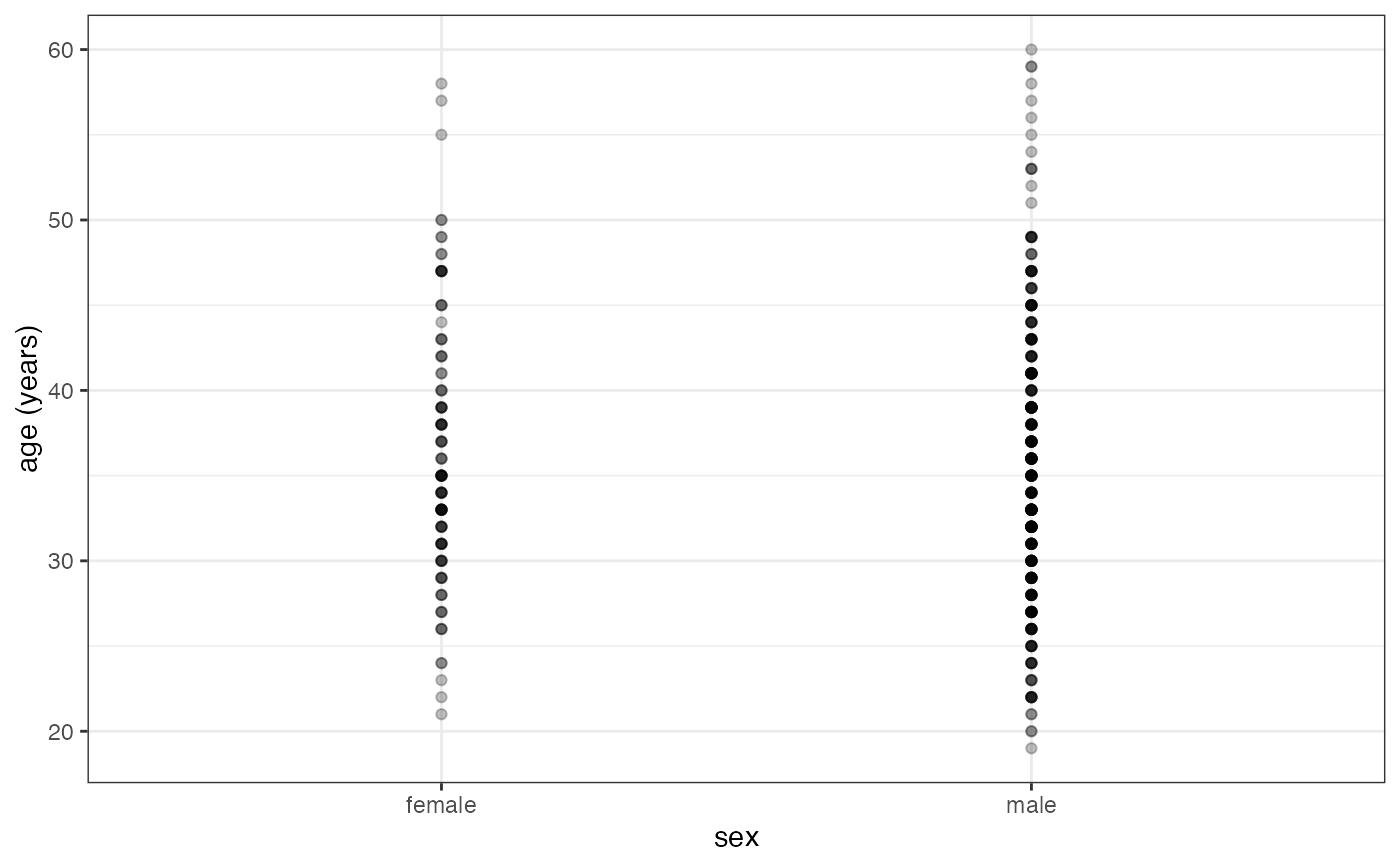 gf_jitter(age ~ sex, alpha = 0.25, data = mosaicData::HELPrct, width = 0.2, height = 0)