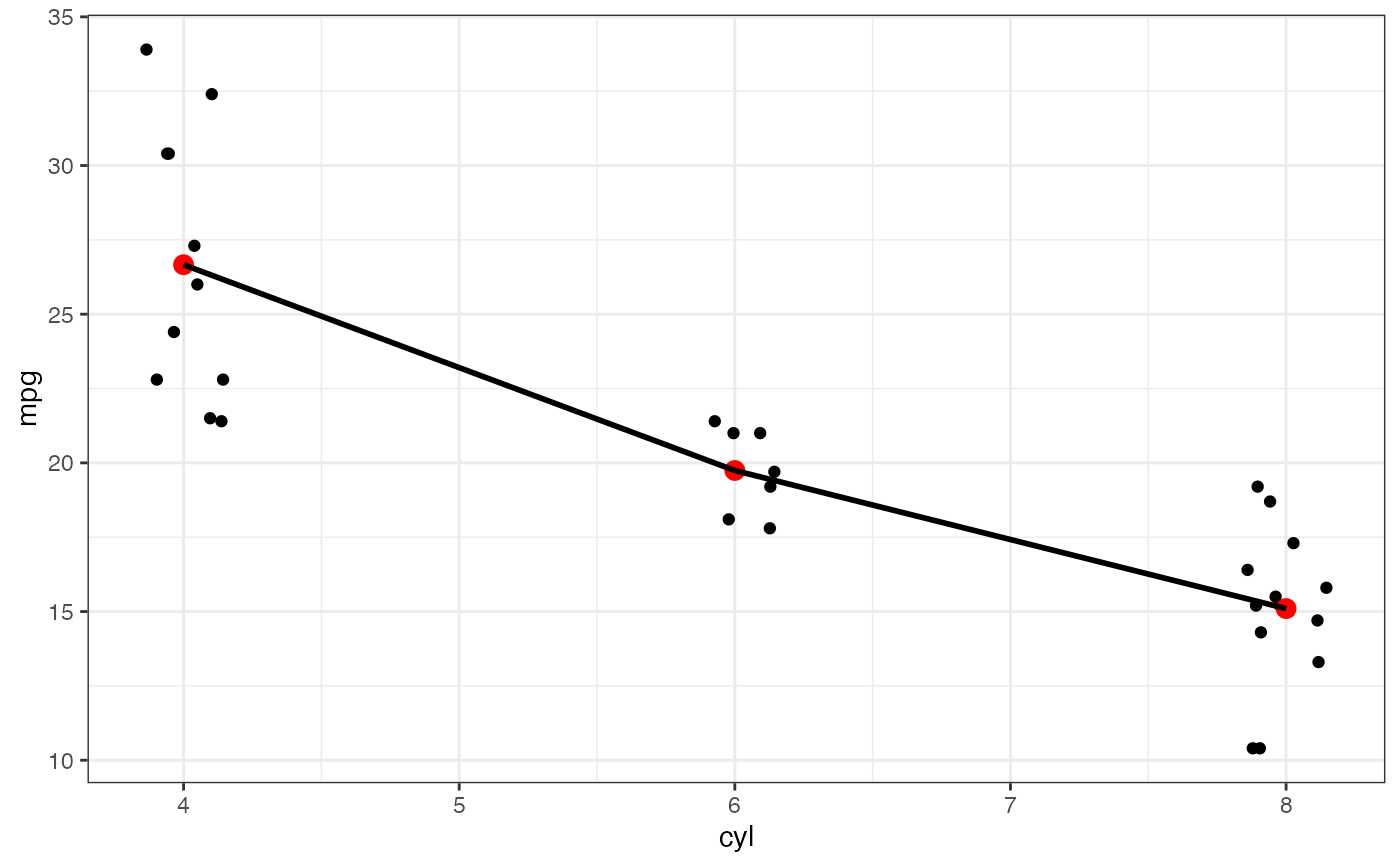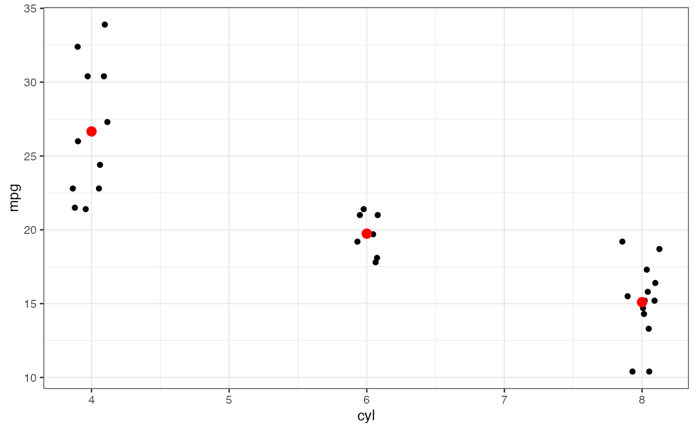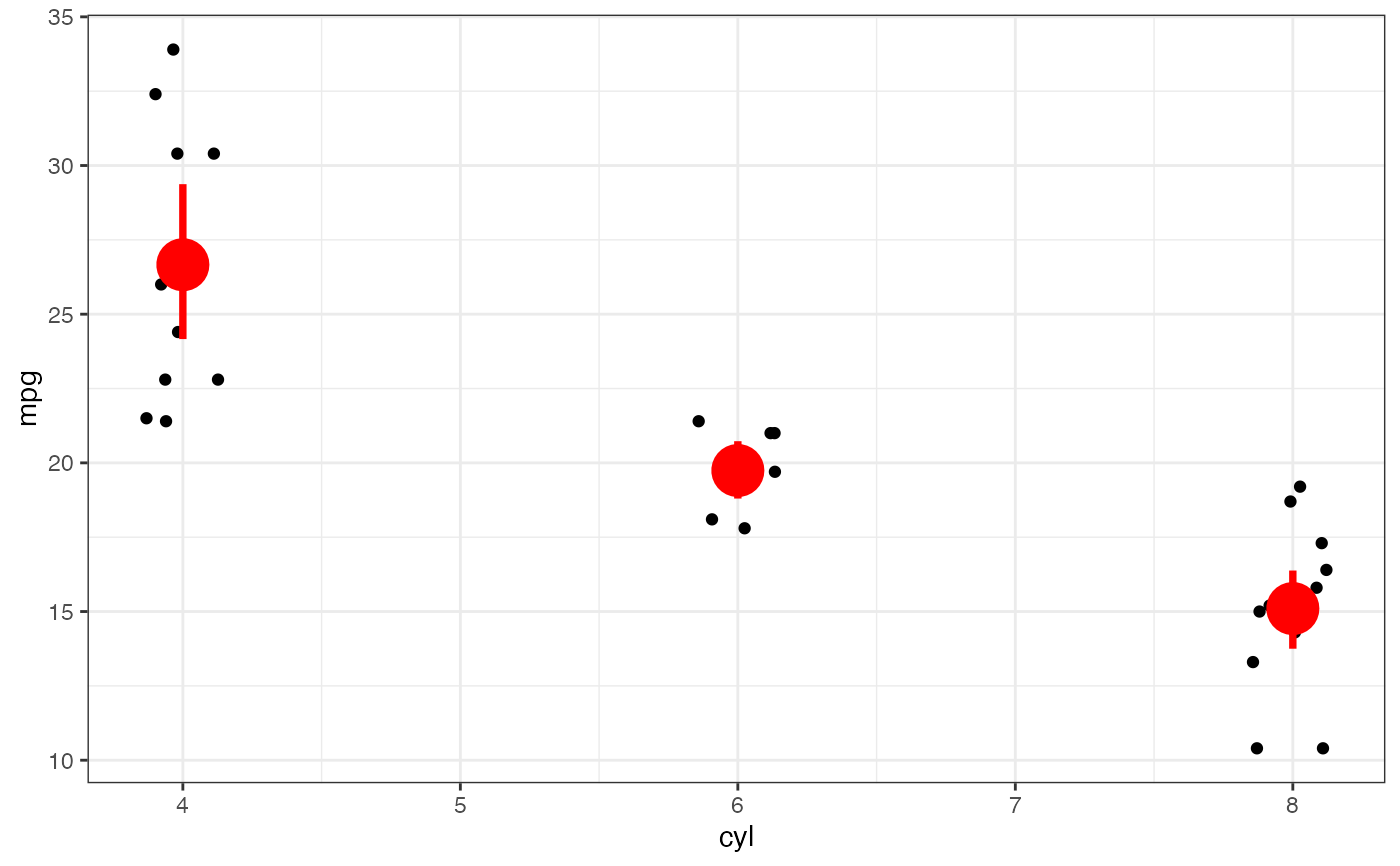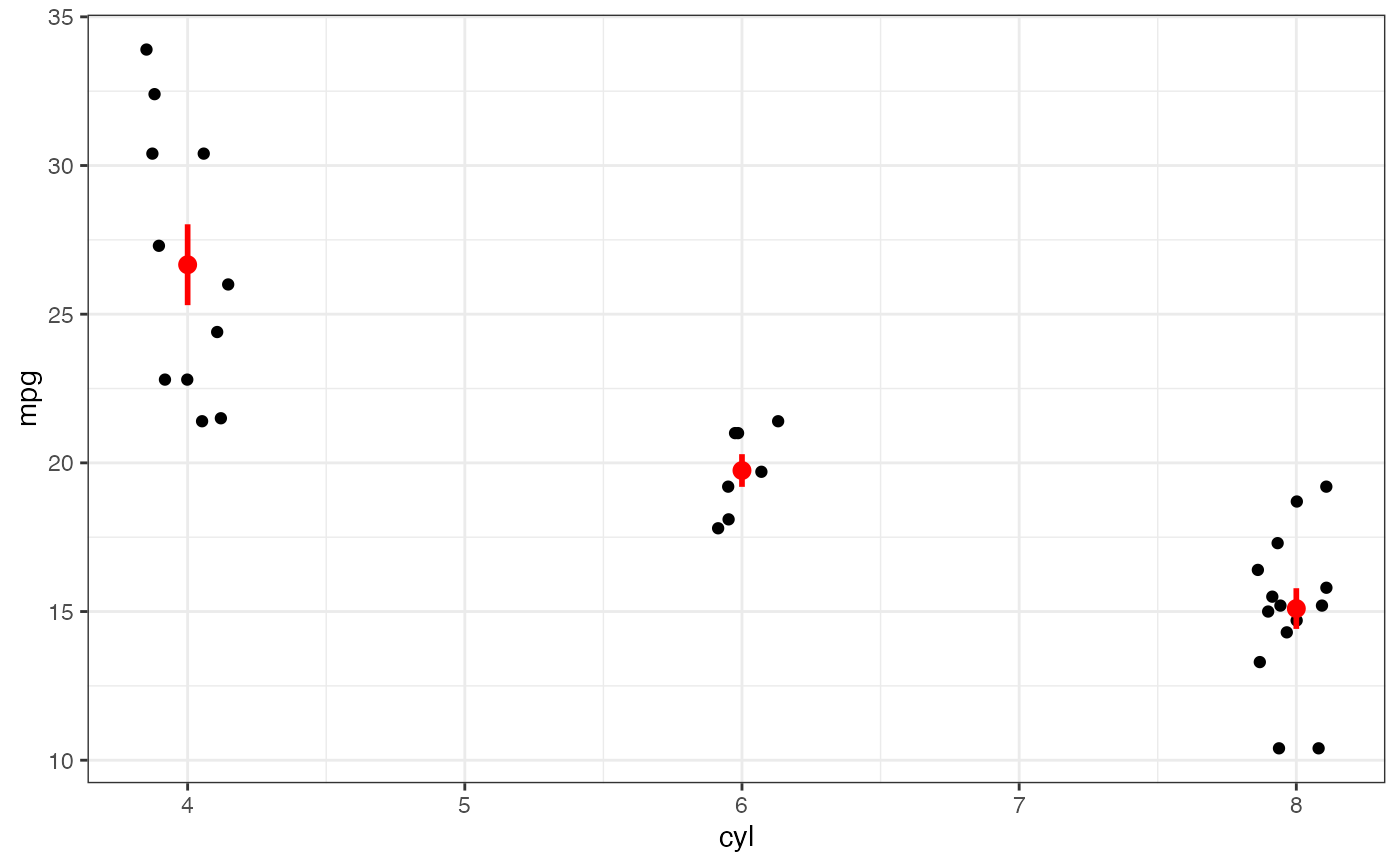 p |> gf_summary(fun.data = mean_sdl, group = ~ cyl, color = "red",