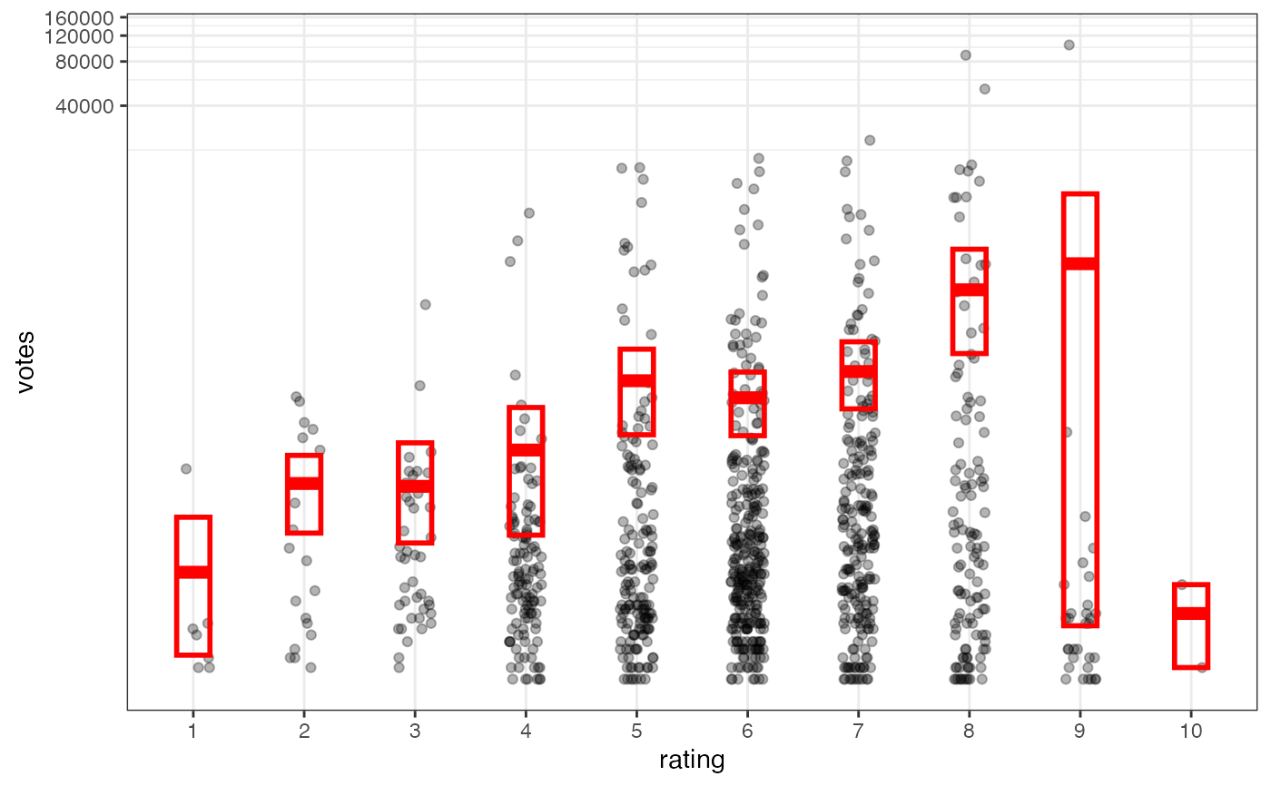 m2 <- gf_jitter(votes ~ factor(round(rating)), data = Mov, width = 0.15, height = 0, alpha = 0.3)