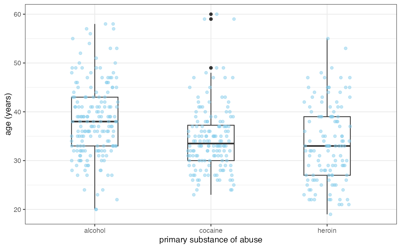 gf_boxplot(age ~ substance, data = HELPrct, width = 0.4) |>