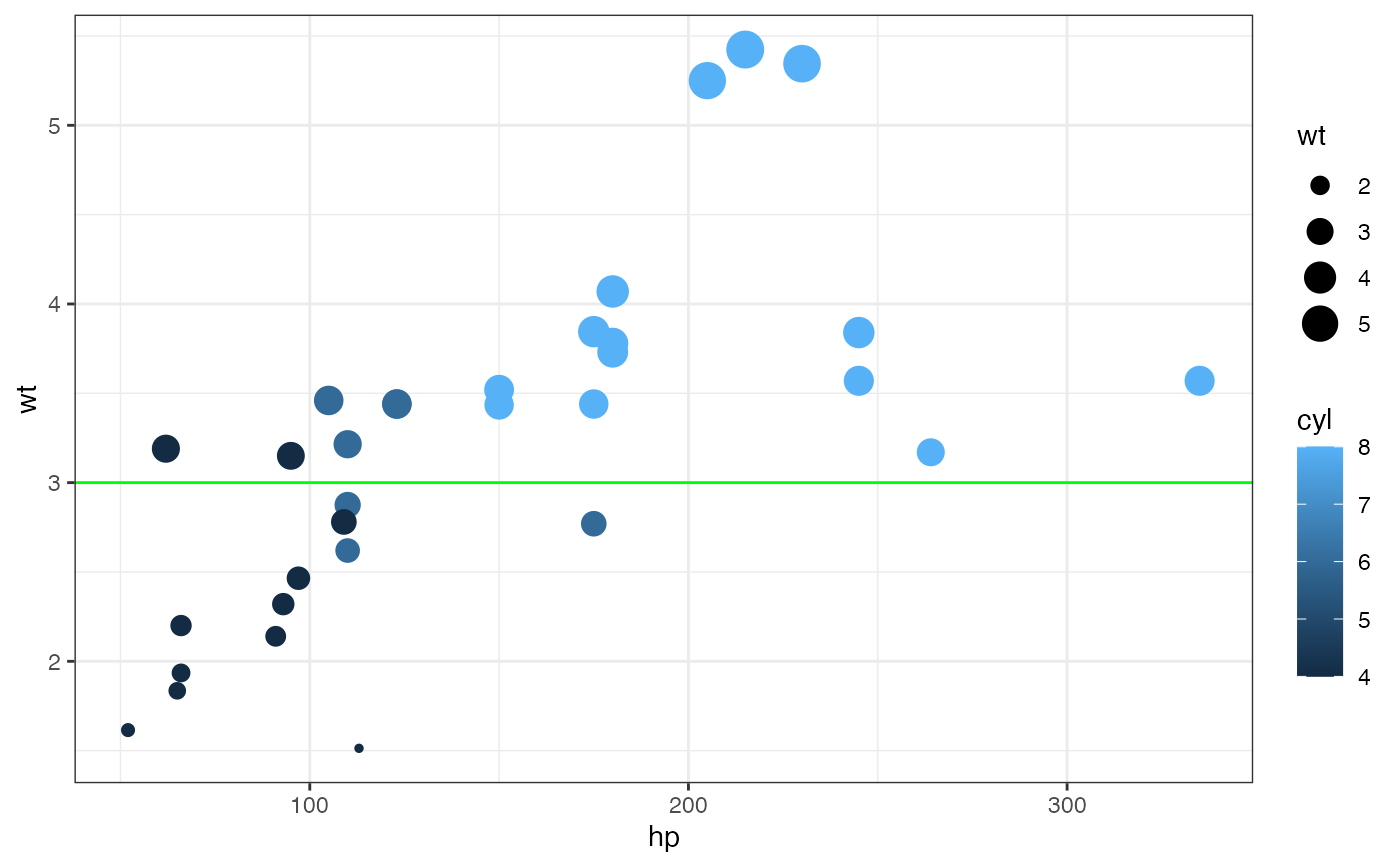 gf_point(mpg ~ hp, size = ~wt, data = mtcars, alpha = 0.3) |>