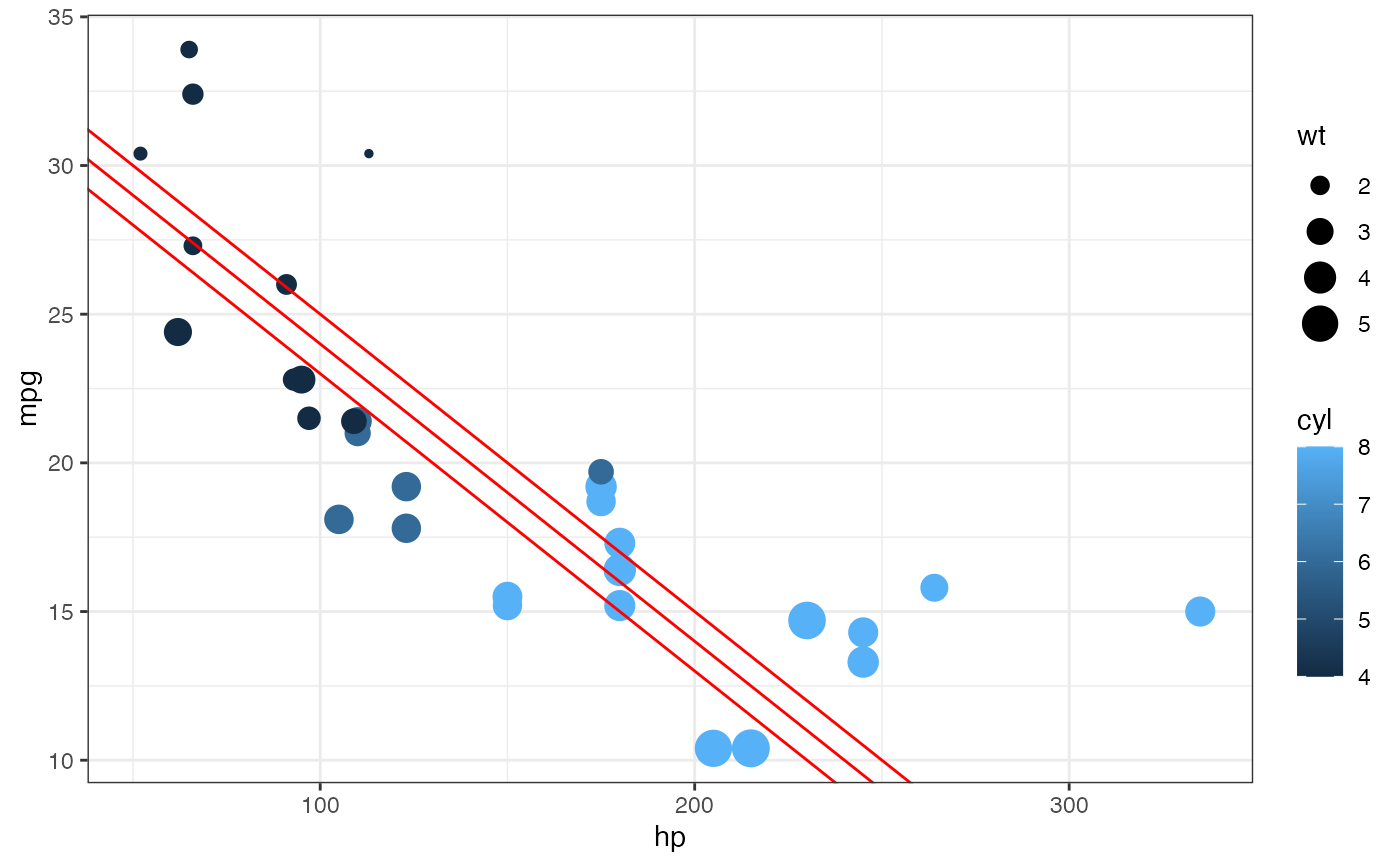 gf_point(mpg ~ hp, size = ~wt, color = ~ factor(cyl), data = mtcars, alpha = 0.3) |>
