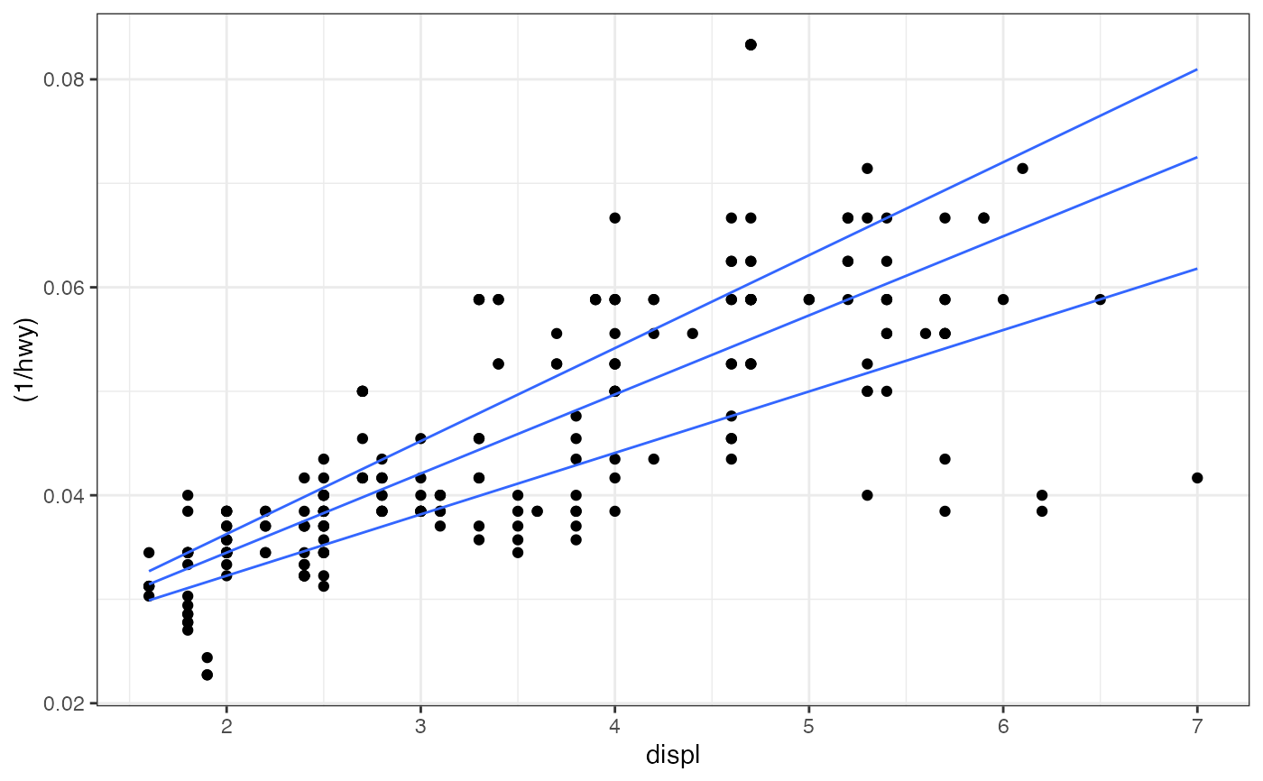 gf_point((1 / hwy) ~ displ, data = mpg) |>