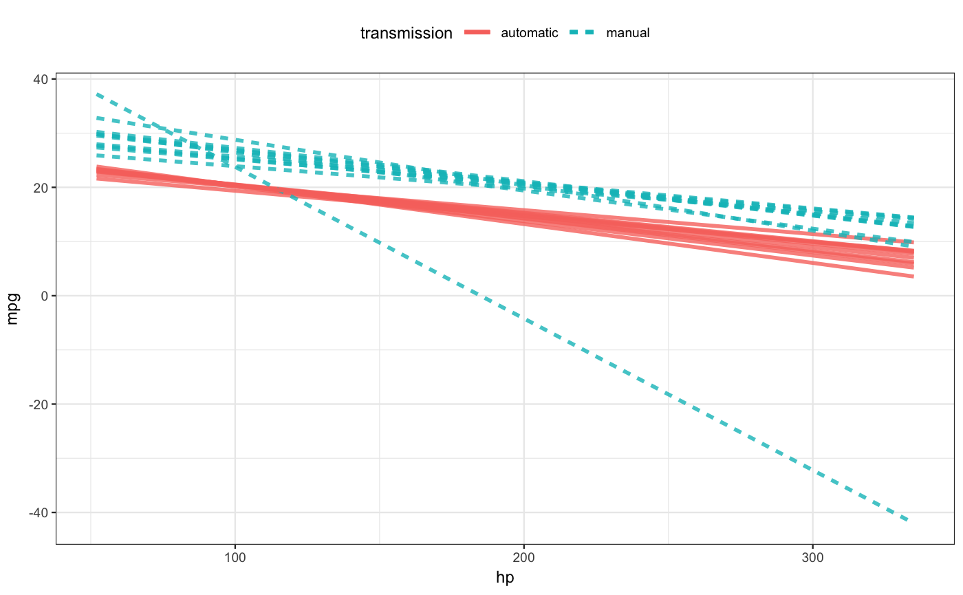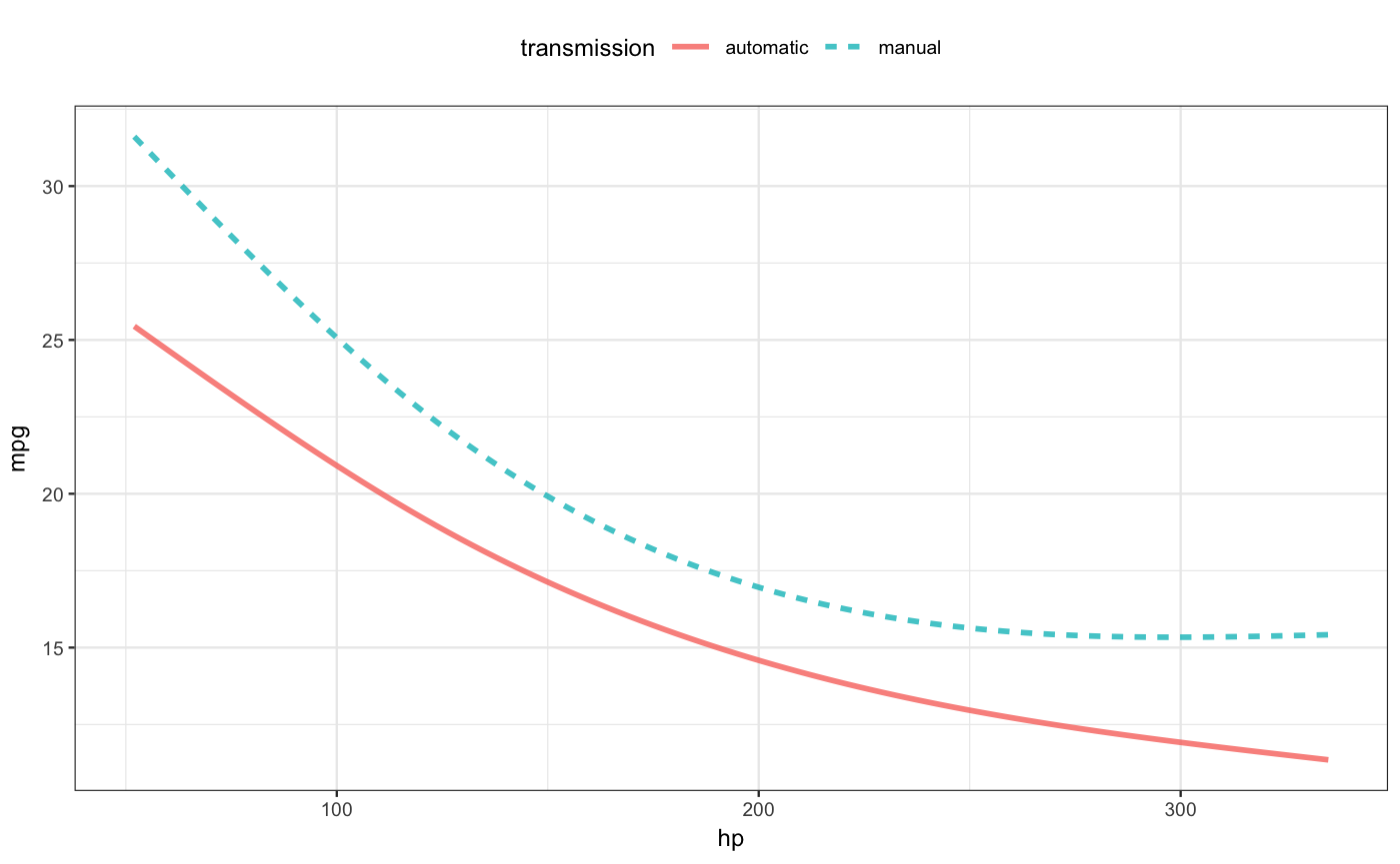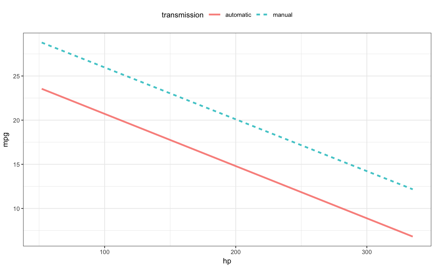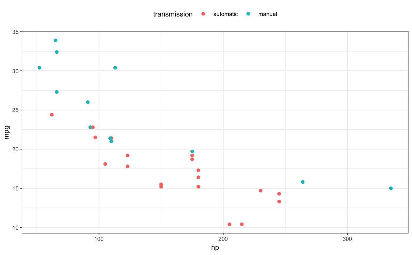 a formula specifying the role of each explanatory variable. For instance, the formula ~ transmission + hp would put the categorical transmission variable on the x-axis and use hp for color. Additional variables, if any, get used for faceting the graphic.