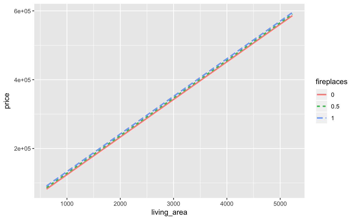 mod_1 <- lm(price ~ fireplaces, data = Houses_for_sale) mod_2 <- lm(price ~ fireplaces + living_area, data = Houses_for_sale) mod_effect(mod_1, ~ fireplaces)#> slope fireplaces to_fireplaces #> 1 66698.82 1 1.4#> slope fireplaces to_fireplaces living_area #> 1 8962.44 1 1.4 1600